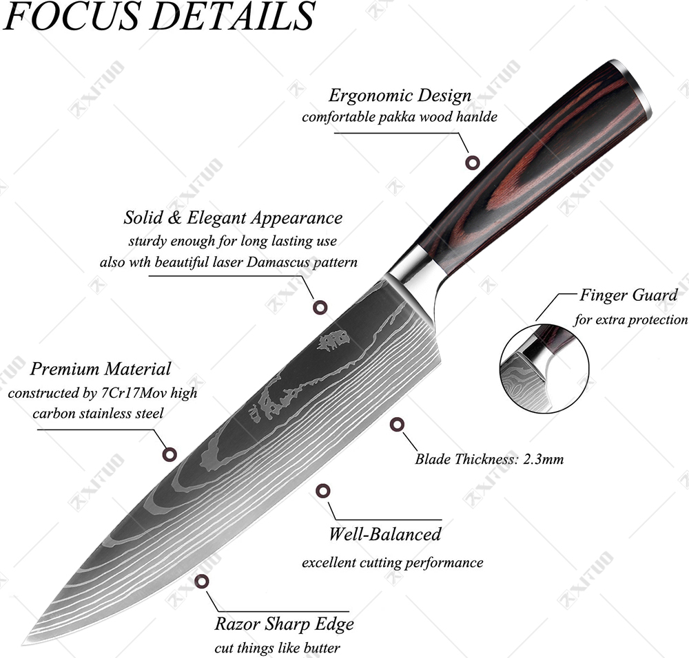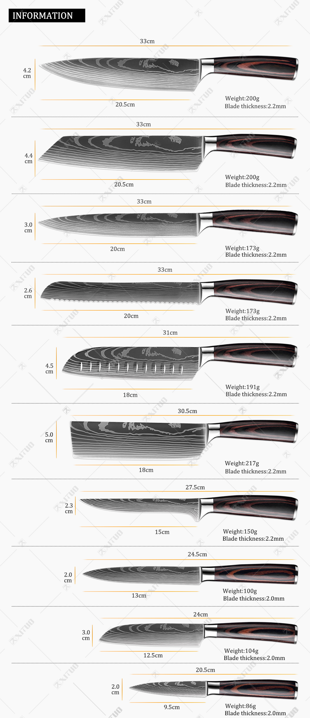 Советы: лезвие из нержавеющей стали 7CR17, поверхность лазерного Дамасского узора, очень красивая, хорошее качество изготовления, бритва, держите свою кухню вдали от тупого ножа и наслаждайтесь жизнью на кухне!
