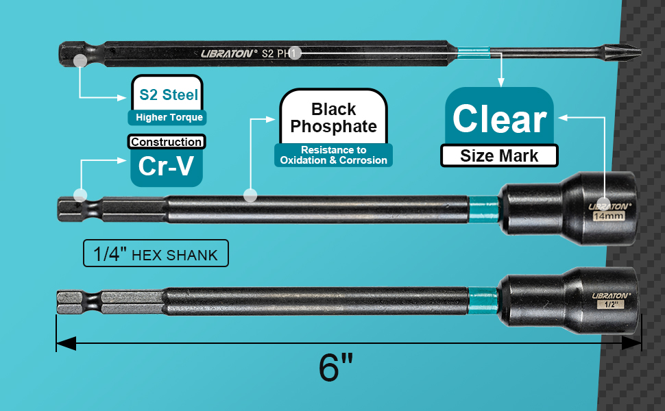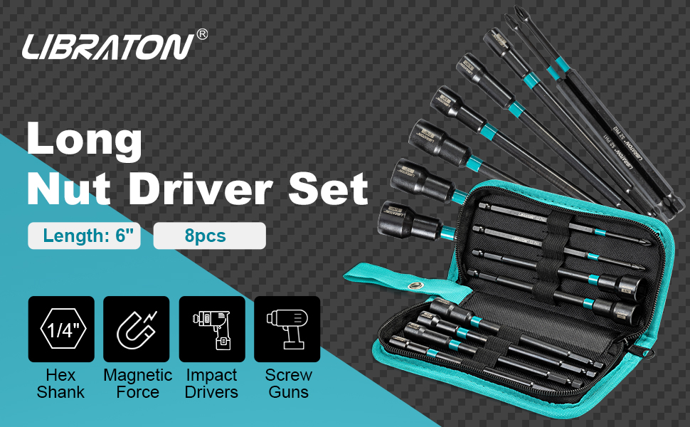 Разумный набор:Набор отверток с магнитной гайкой Libraton 8PCS содержит 6 магнитных гаек SAE (1/4 ''5/16'' 3/8 ''7/16'' 1/2 ''9/16'') и длинное сверло 2PCS (PH1 PH2). Каждая длинная гайка имеет длину 6 дюймов.