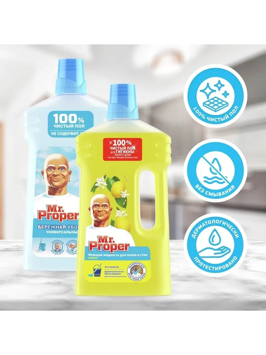 Описание: Универсальное моющее средство Mr. Proper идеально подходит для очищения практически любых твердых поверхностей в доме. Просто разведите 2 колпачка средства в ведре воды, и наслаждайтесь 100% чистым полом. Средство безопасно для всех типов полов и не требует смывания. Попробуйте также линейку Mr. Proper "Бережная уборка" - моющая жидкость безопасна для домов с детьми, дерматологически протестирована и содержит пониженное количество красителей и ароматизаторов.- 100% чистый пол без смывания - Не содержит хлор и аммиак - Дерматологически протестировано.