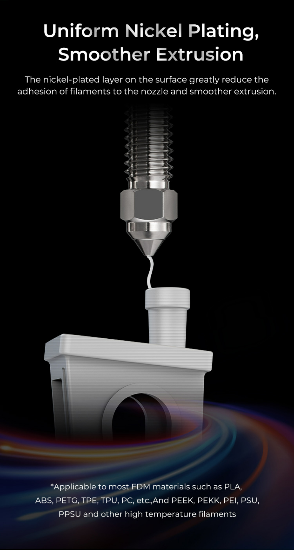 Никелированный слой на поверхности значительно снижает адгезию нитей к соплу и обеспечивает более плавную экструзию.
