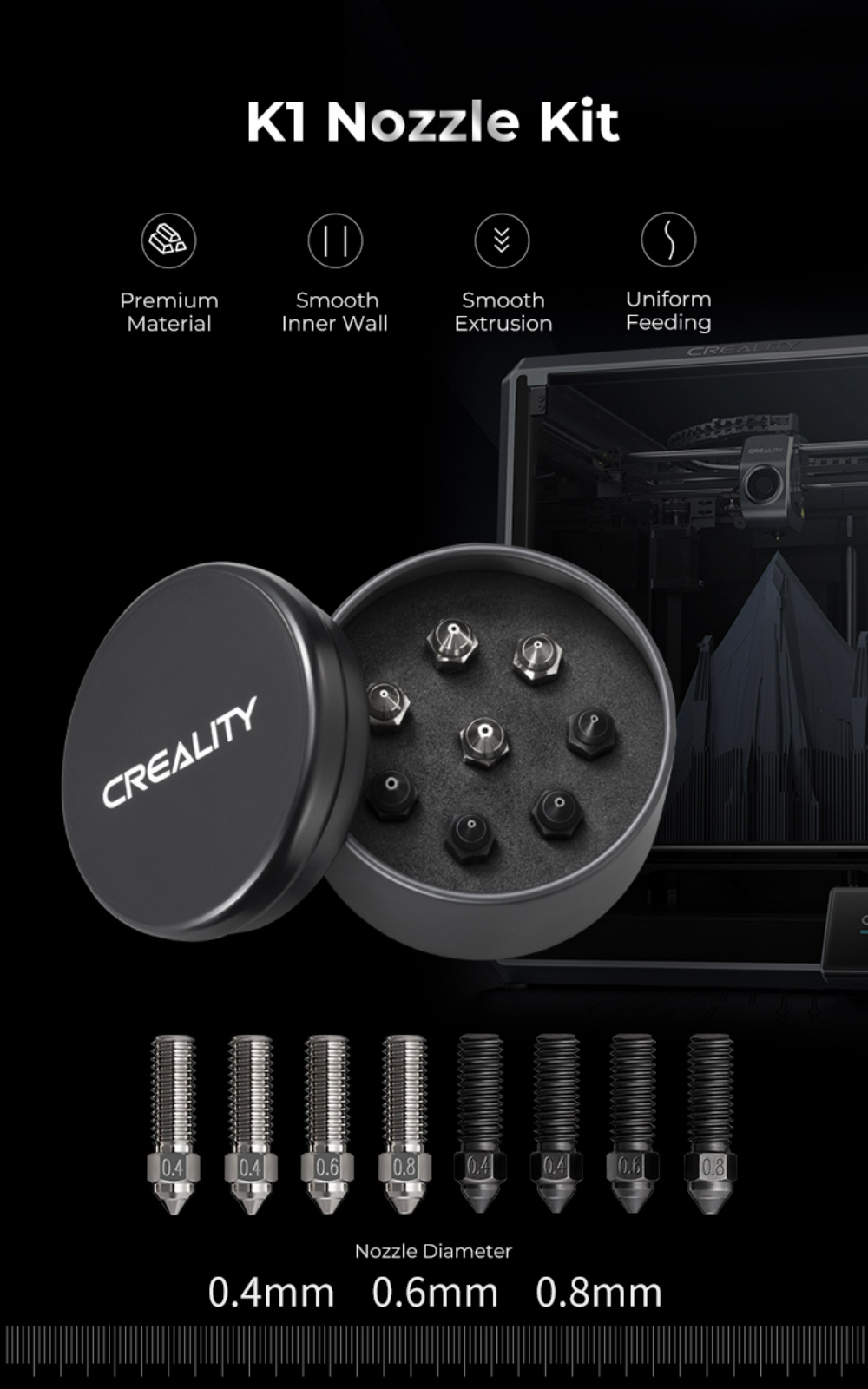 CREALITY Official 8 шт. Комплект сопел K1 Закаленная сталь из медного сплава 600 мм/с Высокоскоростная печать для 3D-принтера K1 / K1 Max / CR-M4