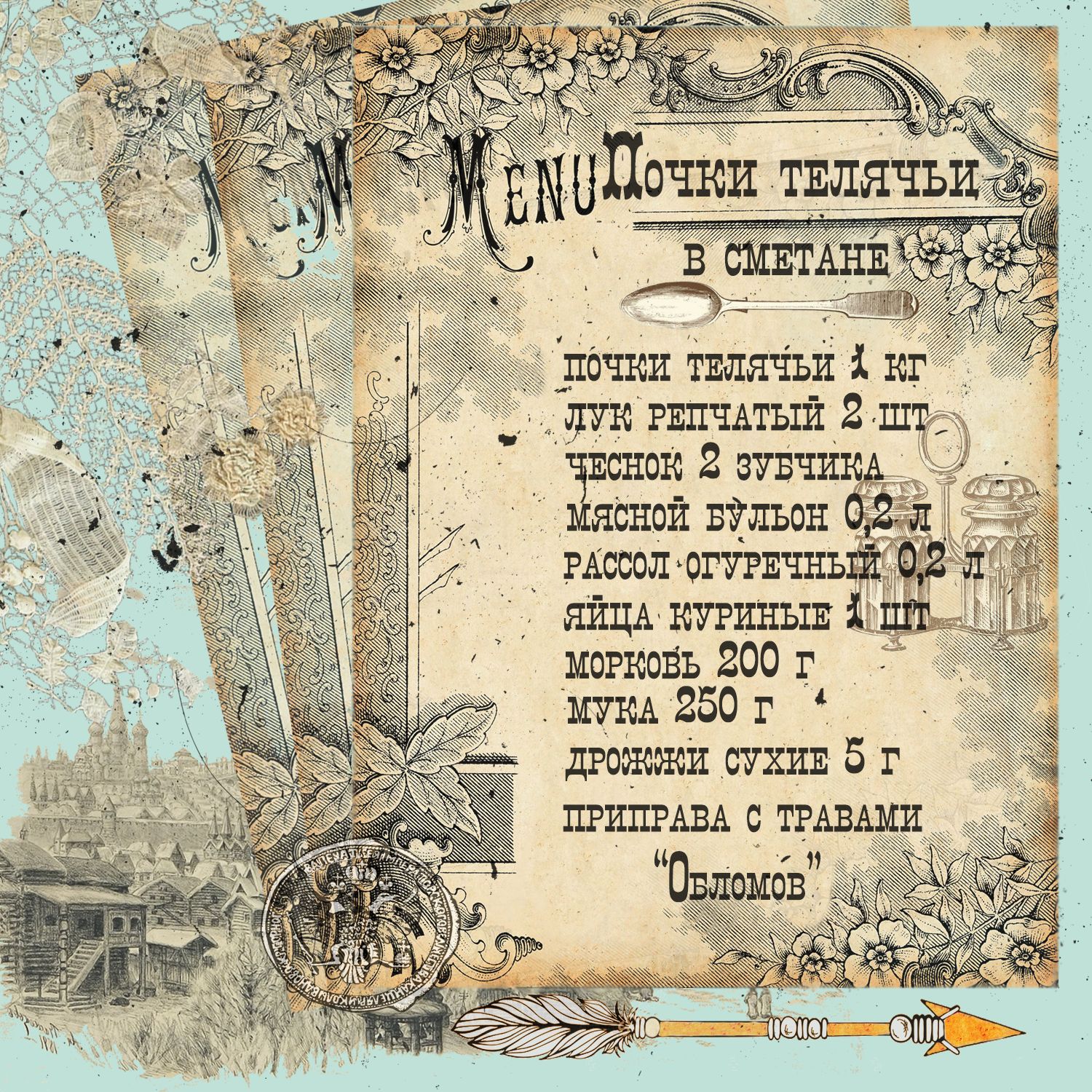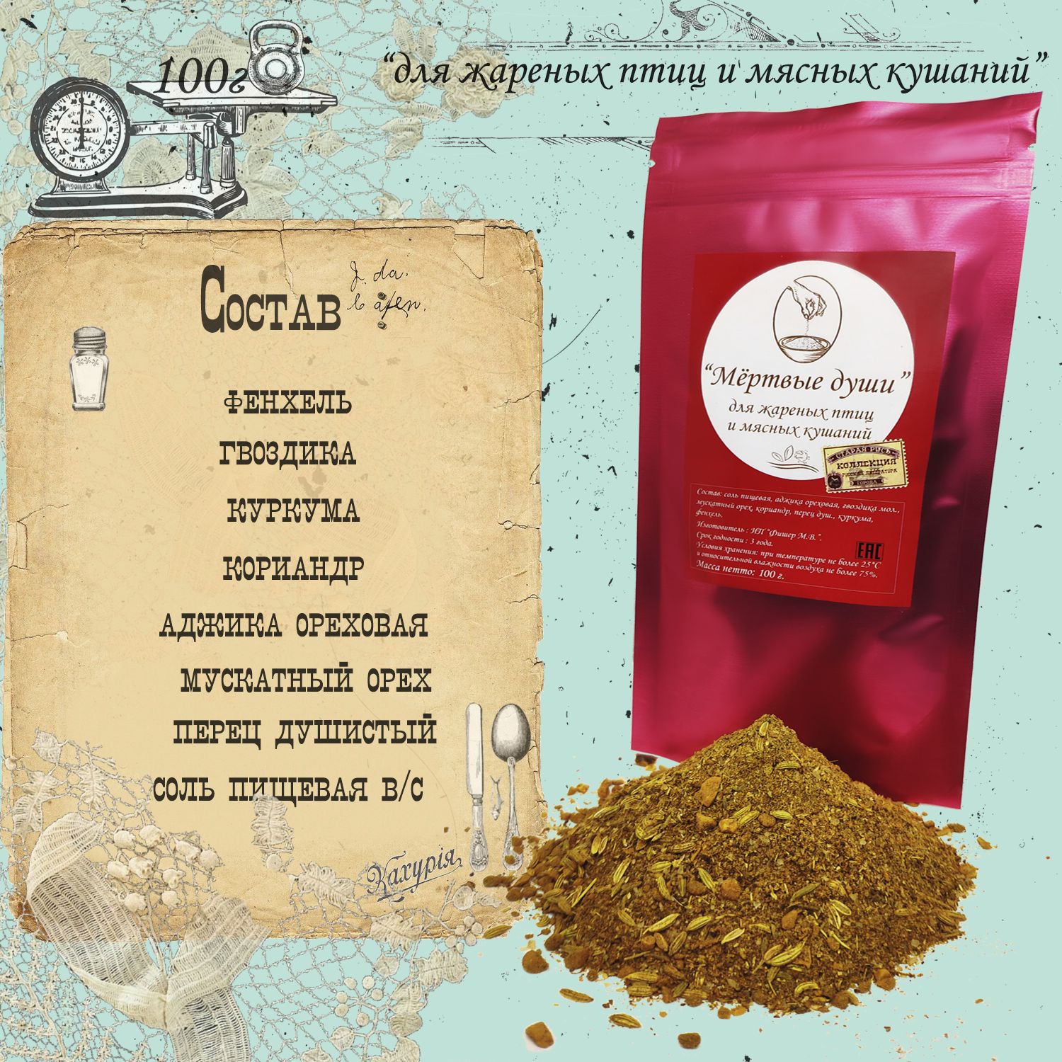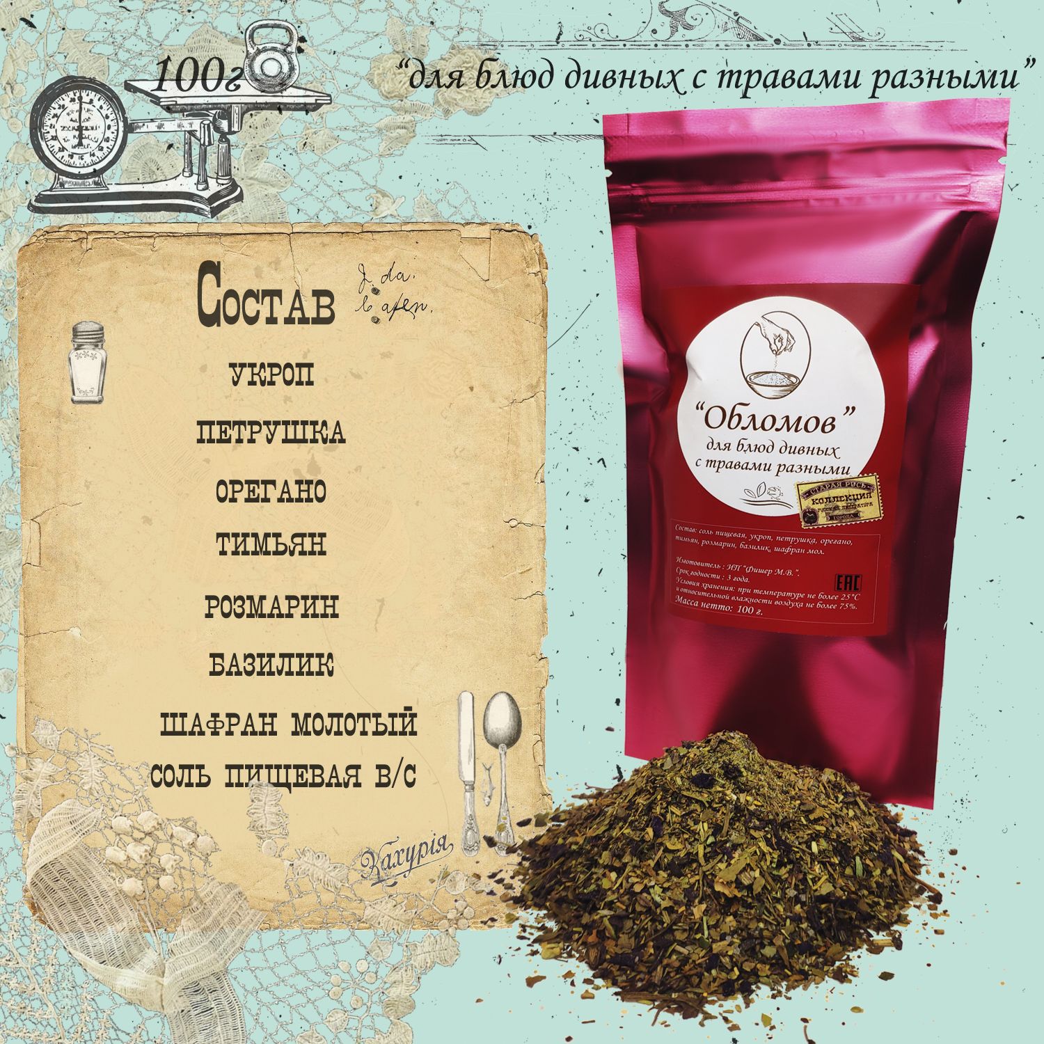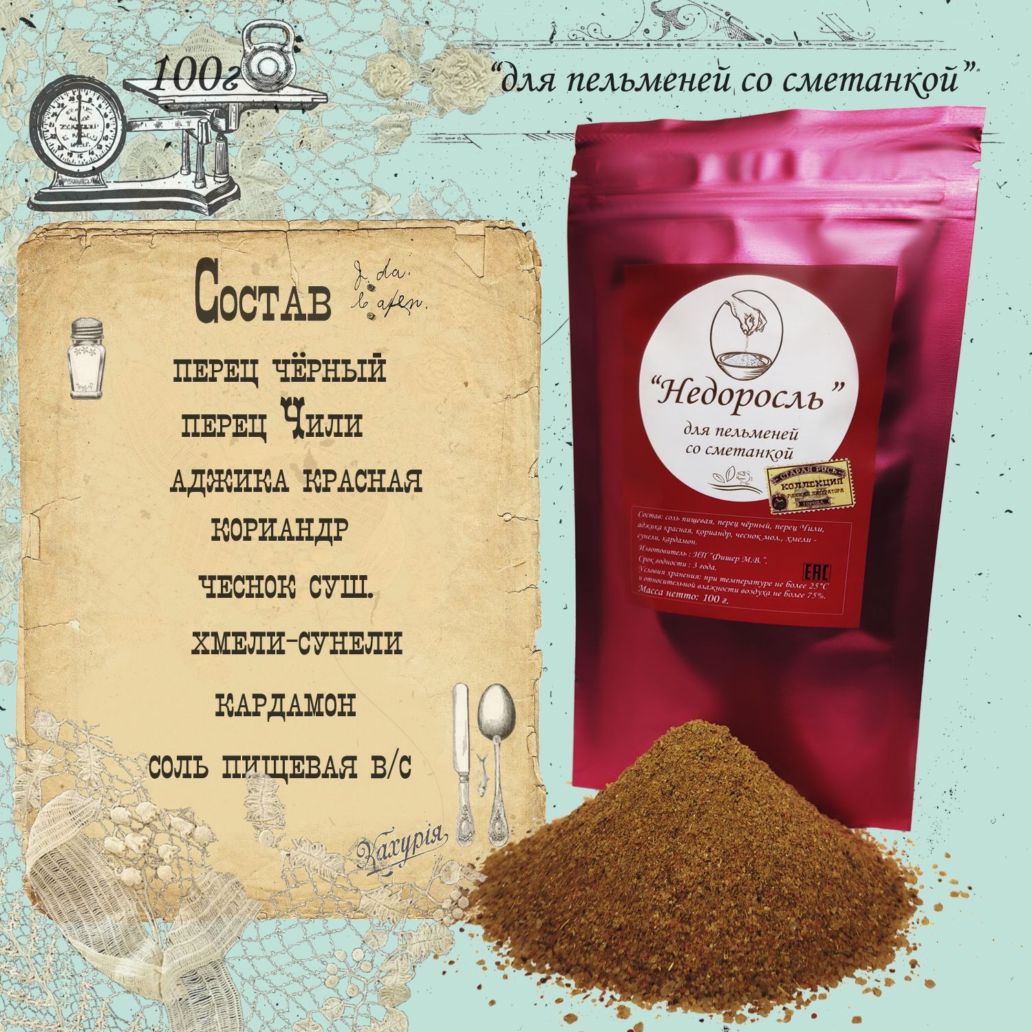 "Недоросль": перец чёрный мол., перец Чили мол., аджика красная, кориандр мол., чеснок мол., хмели-сунели, кардамон, соль пищевая. "Мёртвые души": аджика ореховая, гвоздика мол., мускатный орех мол., кориандр мол., перец душистый мол., куркума, фенхель, соль пищевая. "Обломов": укроп суш., петрушка суш., орегано суш., тимьян суш., розмарин суш., базилик суш., шафран мол., соль пищевая.
