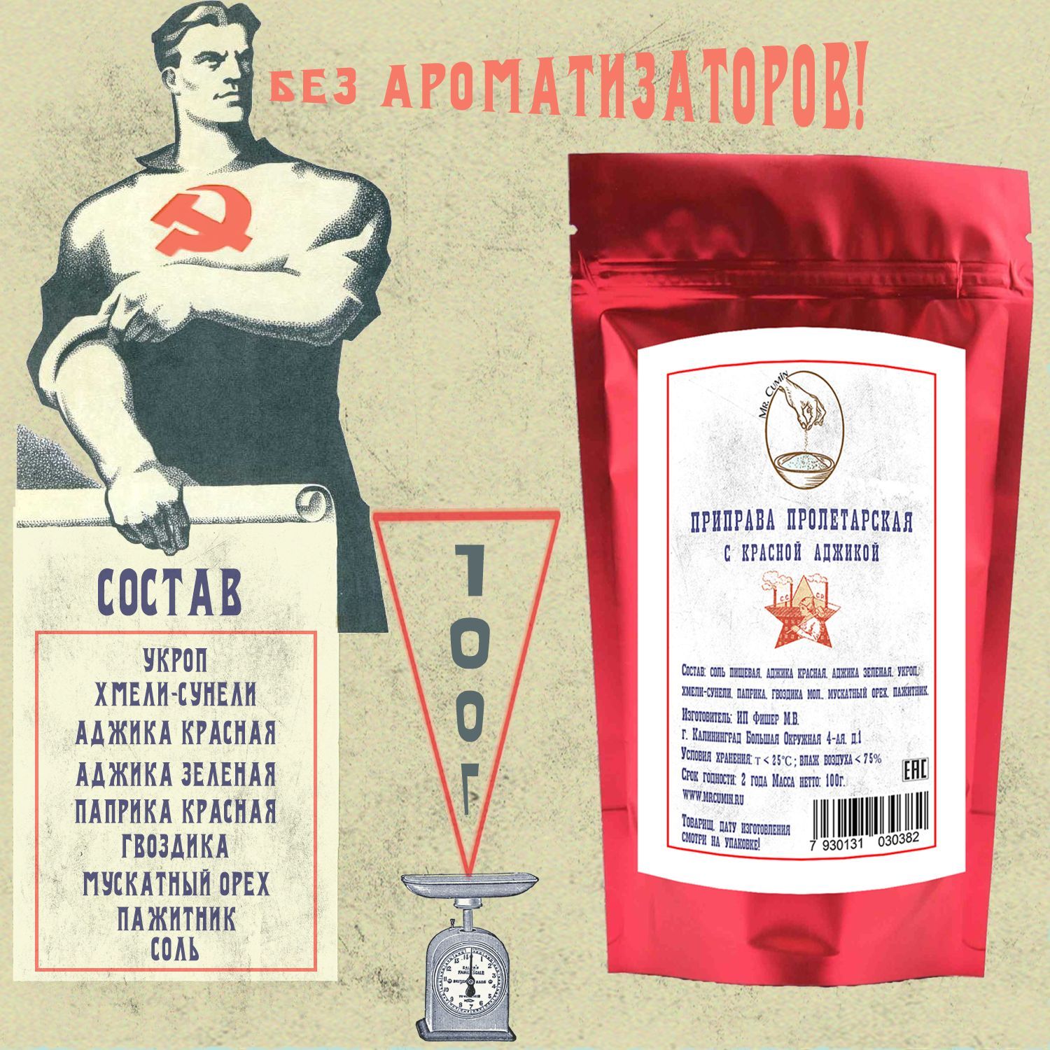 "Приправа Пролетарская": укроп, хмели-сунели, аджика сухая красная, аджика сухая зеленая, паприка красная, гвоздика, мускатный орех, пажитник, соль пищевая. "Приправа от Наркомснаба": сумах, кориандр, зира, мускатный орех, тимьян, перец черный, орегано, петрушка, соль пищевая. "Приправа для ударников соцтруда": перец зеленый острый, паприка зеленая, кориандр, тмин, укроп семя, мускатный орех, розмарин, тимьян, соль пищевая.