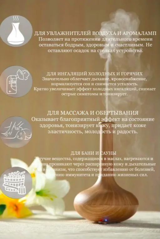 Описание: Масло можно добавлять в увлажнитель воздуха, а также эффективно и в обычной арома-вазе с водой, диффузоре, аромалампе, можно использовать в бане. Эфирные водорастворимые масла для увлажнителя воздуха оставляют приятный аромат в помещении. Идеально подойдет к увлажнителям воздуха.