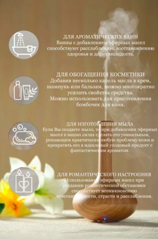 Описание: Масло можно добавлять в увлажнитель воздуха, а также эффективно и в обычной арома-вазе с водой, диффузоре, аромалампе, можно использовать в бане. Эфирные водорастворимые масла для увлажнителя воздуха оставляют приятный аромат в помещении. Идеально подойдет к увлажнителям воздуха.