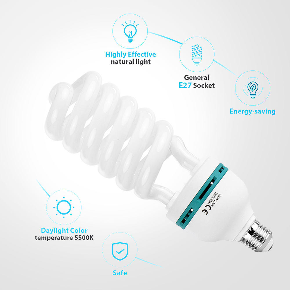Высокая мощность Светильник лампы: 150 Вт светильник высокой мощности лампы с более высокой яркостью очень Энергосберегающие; С цветовой температурой 5500k, лампы производят хорошо сбалансированные чисто белые светильник, чтобы обеспечить вам хорошую фотографическую среду.
