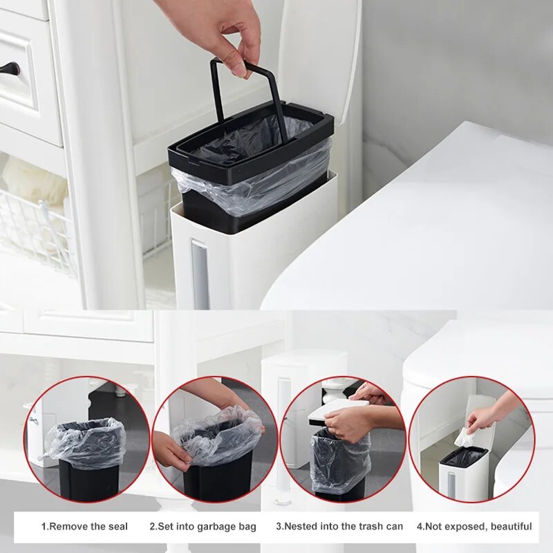 Функция 4 в 1: дозатор мешков для мусора, съемный мусорный бак, ершик для унитаза и держатель ершика для унитаза.Интегрированный дизайн отвечает повседневным потребностям в ванной комнате. Экономия места и многофункциональность.