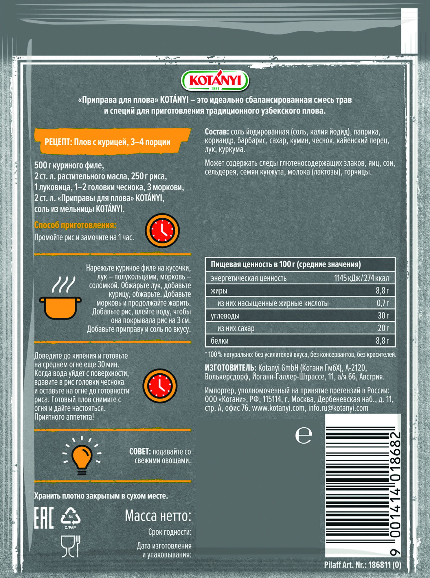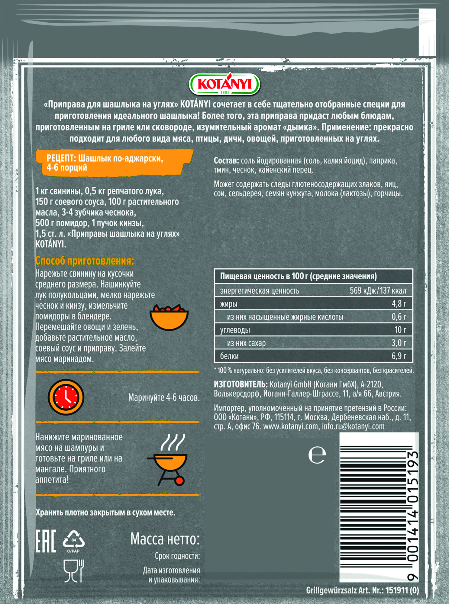 Приправа для риля и шашлыка Шашлык на улях (соль йодированная (соль, калия йодид), паприка, тмин, чеснок, кайенский перец.), Приправа для плова (соль йодированная (соль, калия йодид), паприка, кориандр, барбарис, сахар, кумин, чеснок, кайенский перец, лук, куркума. ), Приправа для картофеля Деревенская с луком и чесноком (соль йодированная (соль, калия йодид), лук, чеснок, кукурузные крахмал, паприка, розмарин, тимьян, куркума, кайенский перец.)
