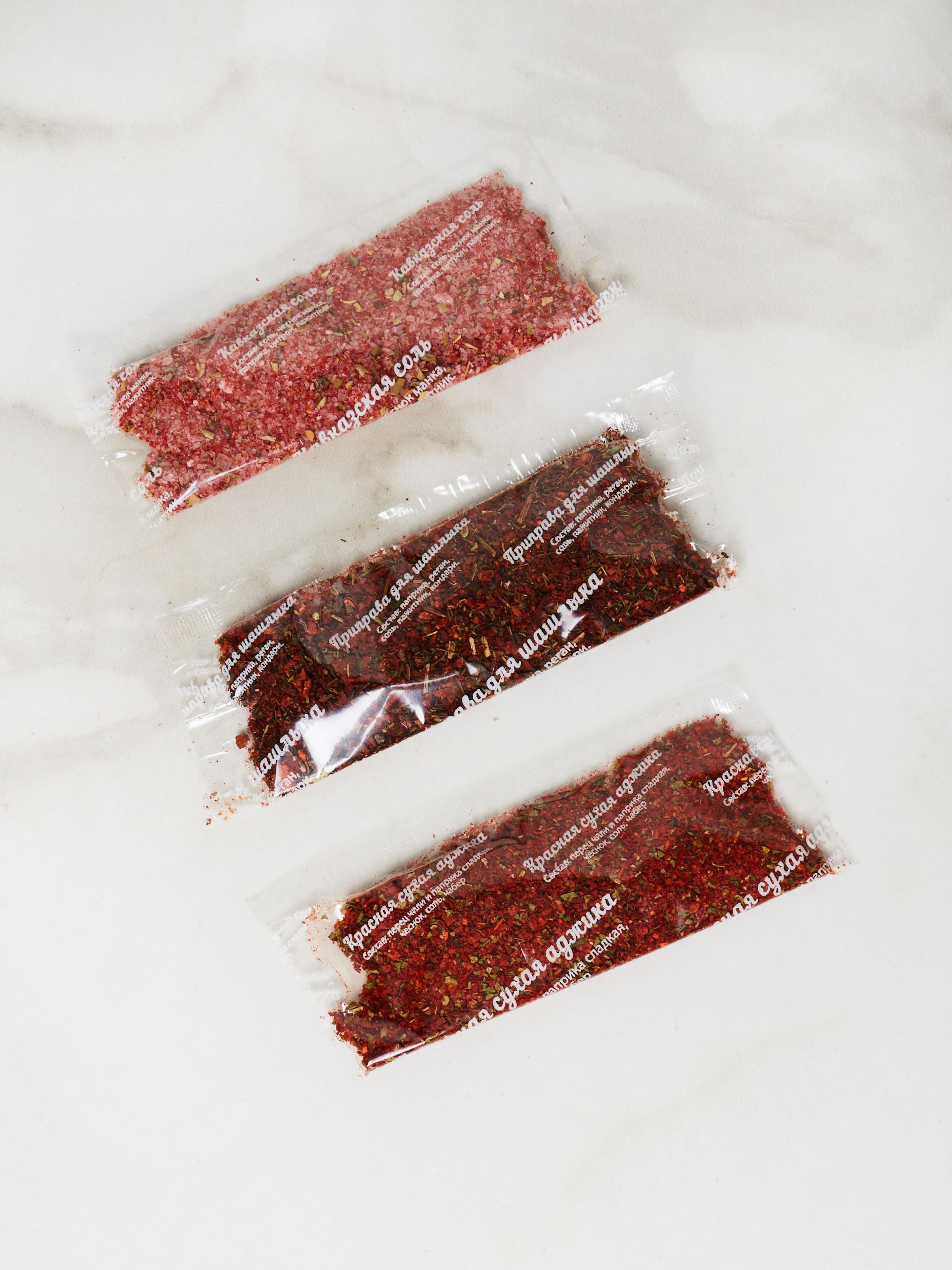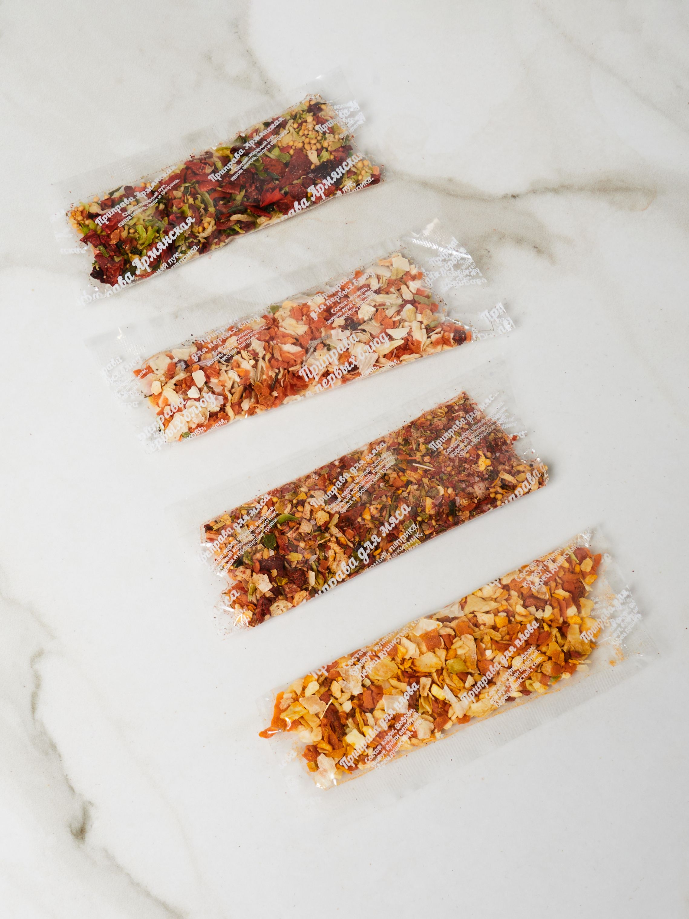 Состав Приправа для мяса: - перец черный; - паприка; - жаренный кориандр; - чаман; - сумах; - прованские травы. Приправа для первых блюд​: ​- корень сельдерея; - зеленый лук; - паприка; - чеснок; - морковь. Сухая красная аджика​: ​- перец чили; - паприка сладкая; - чеснок; - соль; - чабер. Приправа для рыбы​: ​- сумах; - розмарин; - куркума; - имбирь; - эстрагон. Приправа для птицы​: ​- карри; - шафран имеретинский; - хмели-сунели; - уцхо-сунели; - имбирь; - грузинская соль. Приправа для птицы​: ​- карри; - шафран имеретинский; - хмели-сунели; - уцхо-сунели; - имбирь; - грузинская соль. Приправа для плова: ​- соль; - кумин молотый; - кунжут; - имеретинский шафран; - карри; - перец душистый. Приправа для плова​: ​- соль; - кумин молотый; - кунжут; - имеретинский шафран; - карри; - перец душистый. Сванская соль: - соль; - тмин; - чеснок; - шафран; - кориандр; - укроп. Приправа Армянская: ​- жаренный лук; - кинза зелень; - чили; - паприка.