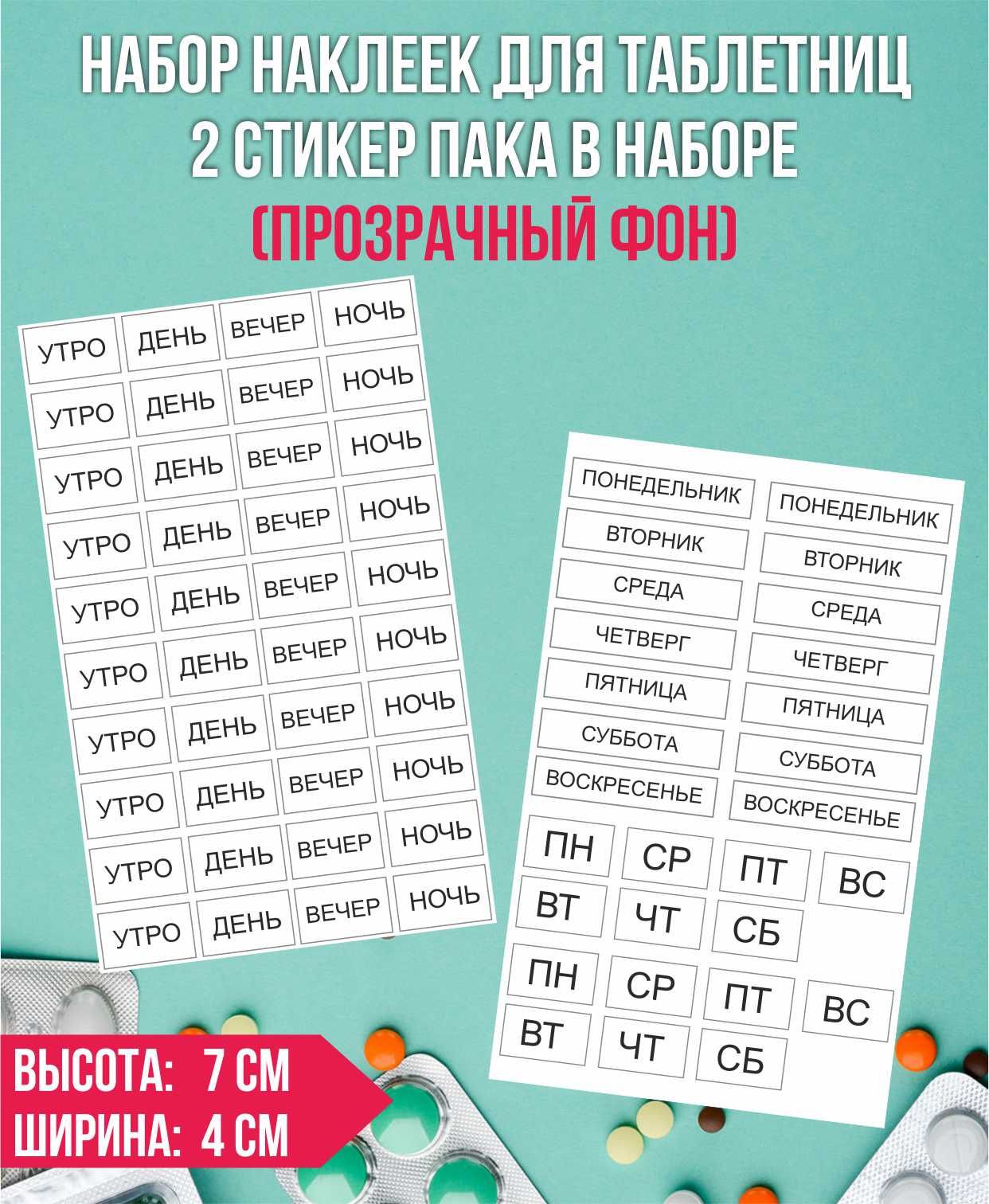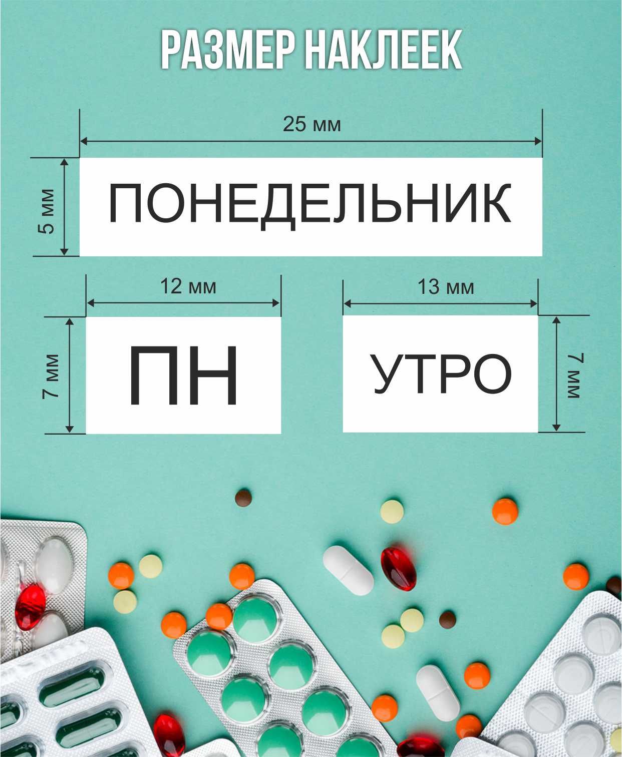 Описание: Если ваша таблетница потеряла первозданный вид и все важные буквы на ней стерлись, не спешите ее выкидывать и заказывать новую! Есть отличная альтернатива - НАКЛЕЙКИ! Наша компания предоставляет два вариант исполнения наклеек на белой пленке и прозрачной. Маленькие, аккуратные и разноформатные наклейки подойдут для всех видов таблетниц. Наклейки для таблетниц выполнены с запасом. Проявите заботу о своих близких, подарите им полезный сувенир. Этот маленький сувенир не останется не замеченным. Берегите себя и своих близких!