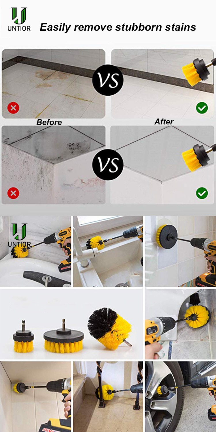 -Этот Набор щеток представляет собой насадку для дрели с силовой щеткой, которая крепится к аккумуляторной дрели. Эти нейлоновые щетинки не царапаются и могут использоваться на ваннах, раковинах, плинтусах, душевых кабинах из стекловолокна, дверных направляющих для душа и фарфоре, чтобы сэкономить время и силы при очистке всех видов различных поверхностей.