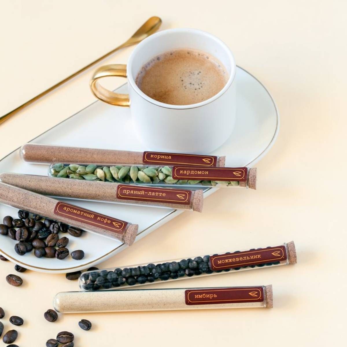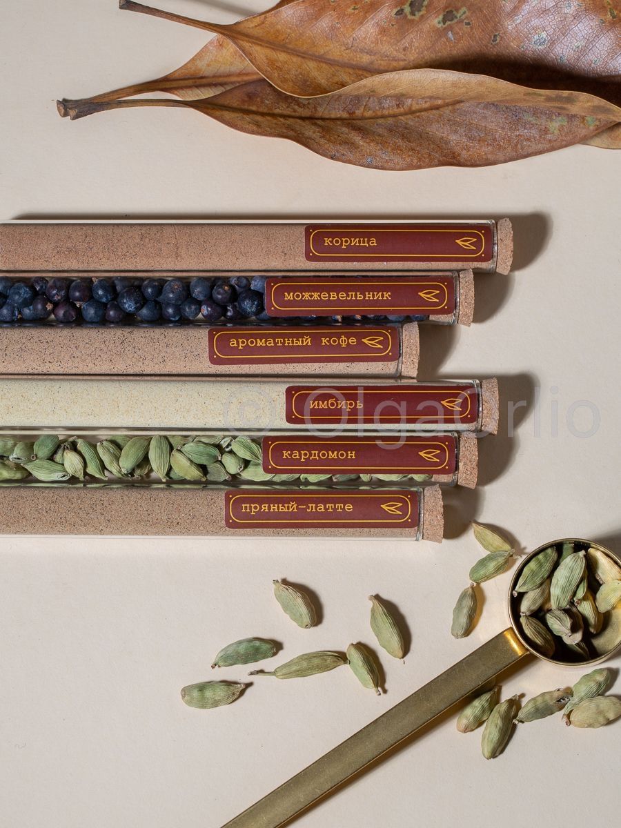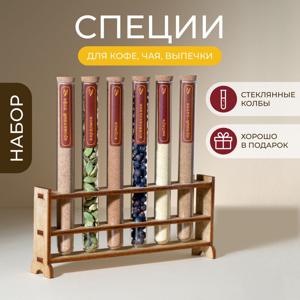 Набор специи для кофе и чая, выпечки подарочный на подставке в стеклянных колбах ( приправы для кофе, латте, капучино / корпоративный подарок коллеге, маме, бабушке, учителю )