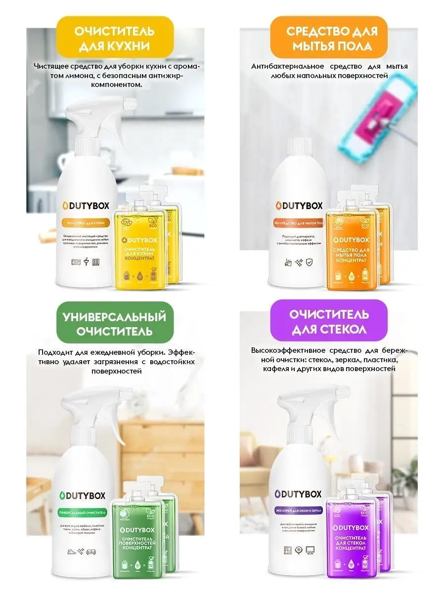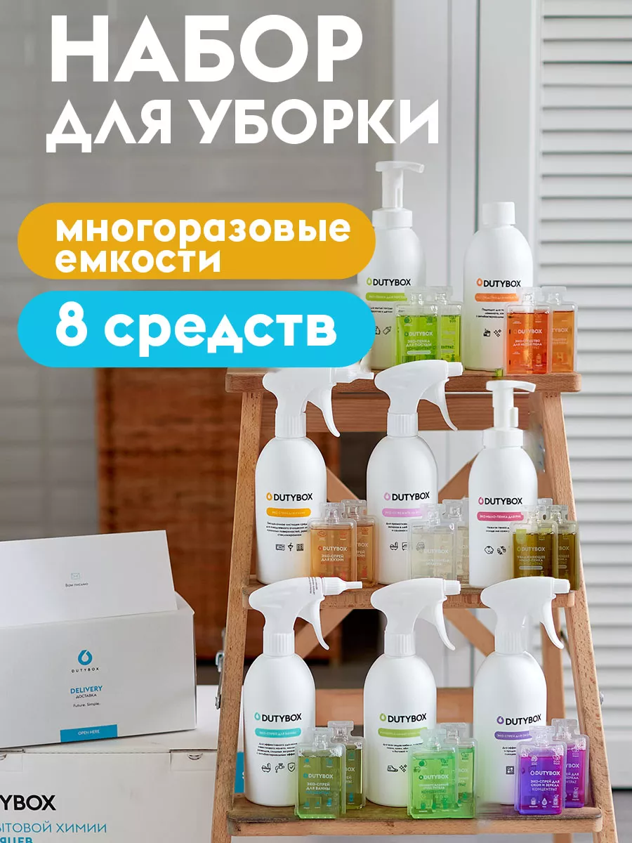 Описание: Набор для уборки Дьютибокс из 8 экологичных моющих средств. Универсальный набор для ухода за вашим домом. Полный набор средств для генеральной уборки дома от Дьюти бокс - это современный и стильный помощник для повседневной жизни, длительная чистота без лишнего наведения порядка. В состав набора входят эффективные средства, в нем есть все для чистоты пола, стеклянных и кухонных поверхностей, ванной и туалетной комнаты. А так же нежное жидкое мыло пенка для рук и средство для мытья посуды. Заказав комплект вы получаете по 2 капсулы с концентратом каждого средства и многоразовые емкости для разведения и использования. 8 средств по 1 литру самого необходимого и эффективного для уборки. Концентрат 50мл необходимо разбавить с 450 мл воды в бутылке, согласно инструкции. Состав набора: 1. Средство для мытья пола, 1л; 2. Средство для мытья посуды, овощей, 0+, 1л; 3. Мыло для рук пенное, 0+, 1л; 4. Средство для мытья стёкол и зеркал 1л; 5. Чистящее средство для кухни антижир, для варочных поверхностей, СВЧ, фартуков и др. 1л; 6. Средство для уборки ванной комнаты, 1л. Для чистки акриловых раковин ванн. Удаляет налет, мыльные подтеки. 7. Универсальное чистящее средство 1л, Для пластика, кожаной мебели. 8. Освежитель воздуха, ароматизатор для дома нейтрализатор запахов ,1л.