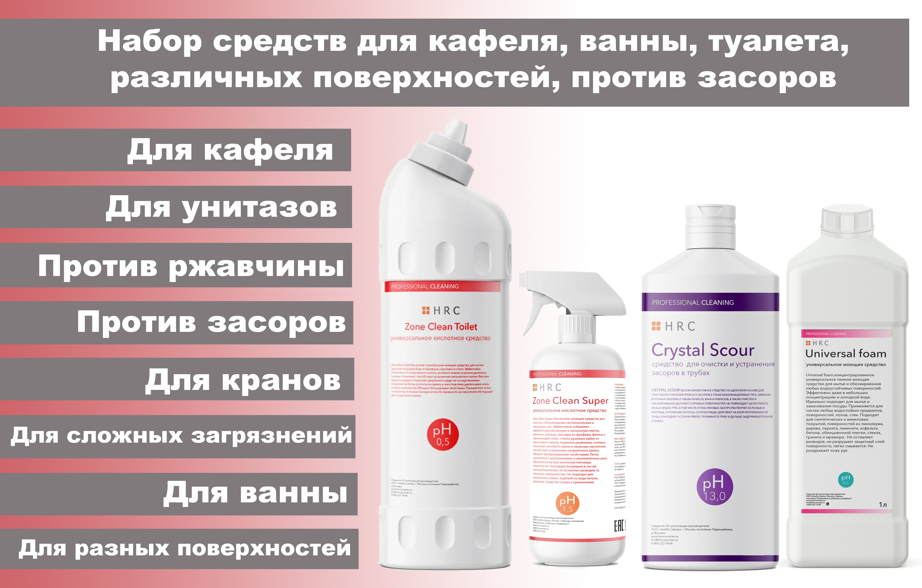 Cредство для кафеля, ванны и туалета Zone Clean Super 500мл; Чистящее средство для ванной и туалета/очиститель для унитаза Zone Clean Toilet, 750мл; Универсальное моющее средство Universal Foam(пенное)1000мл, Средство от засоров Crystal Scour 1000мл