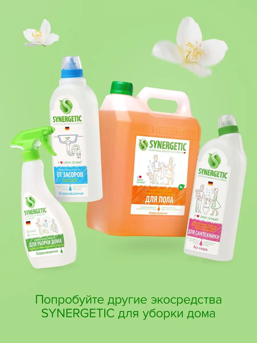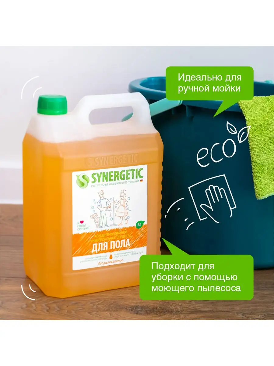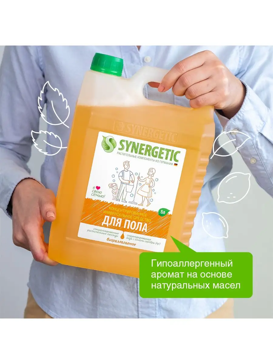 Описание: Биоразлагаемое концентрированное средство для мытья поверхностей SYNERGETIC – универсальное средство для ежедневной и генеральной уборки пола и других поверхностей: столов, стен, потолка. Уникальный комплекс растительных тензидов эффективно удаляет загрязнения и неприятные запахи даже в холодной воде. Комплекс зеленых хелатов предотвращает повторное оседание загрязнений на поверхности. Подходит для металла, стекла, пластика, дерева. Международный экологический сертификат ICEA подтверждает биоразлагаемость, безопасность и эффективность средства. Не требует смывания, не оставляет разводов на поверхности. Подходит для уборки в детских комнатах и учреждениях. Безопасно для домов с питомцами. Содержит гипоаллергенную отдушку с натуральными эфирными маслами сантала, бергамота, мяты и лимона. Инструкция по применению : Добавить в воду 30 мл средства на пять литров воды для обычной уборки или 120 мл средства на пять литров воды для генеральной уборки. Не требует смывания. 1 колпачок (30мл) на 5 литров воды-обычная уборка, 4 колпачка (120 мл) на 5 литров воды -генеральная уборка. Условия хранения: Хранить при температуре не выше 45 °C; под воздействием солнечных лучей возможно изменение цвета. Средство замерзает, после размораживания и перемешивания сохраняет свои свойства. *** У нас есть акции и распродажи, вы можете купить наши товары в подарок со скидкой!