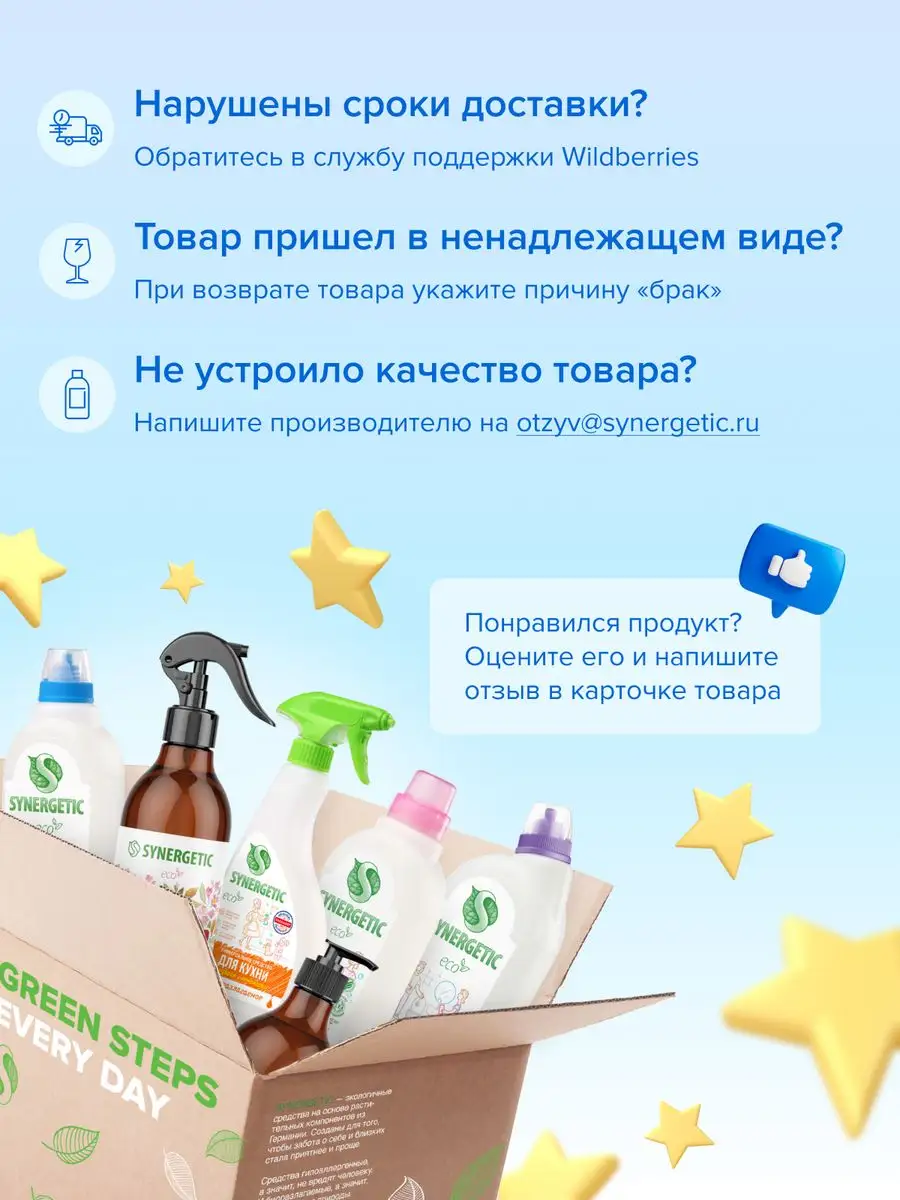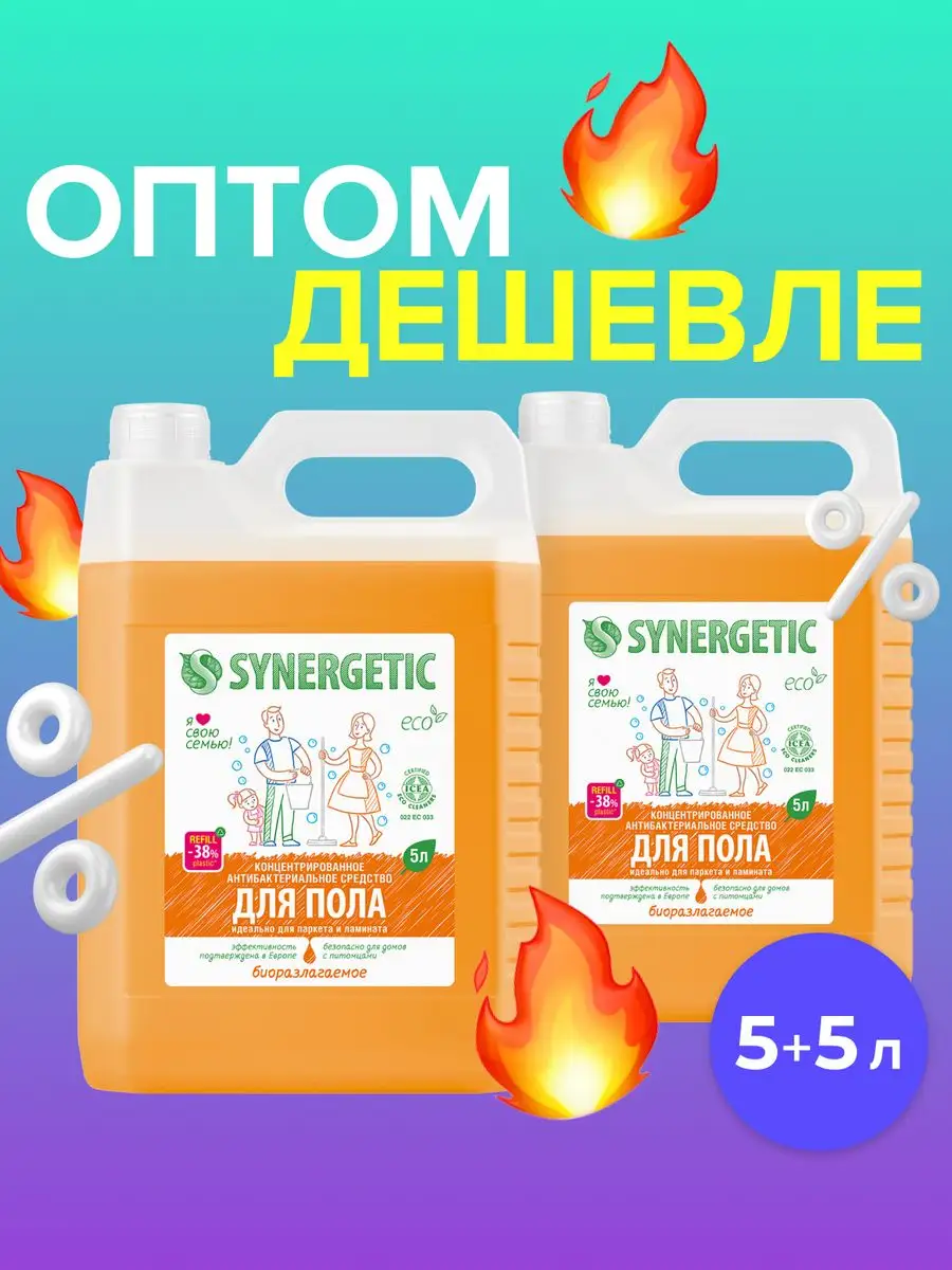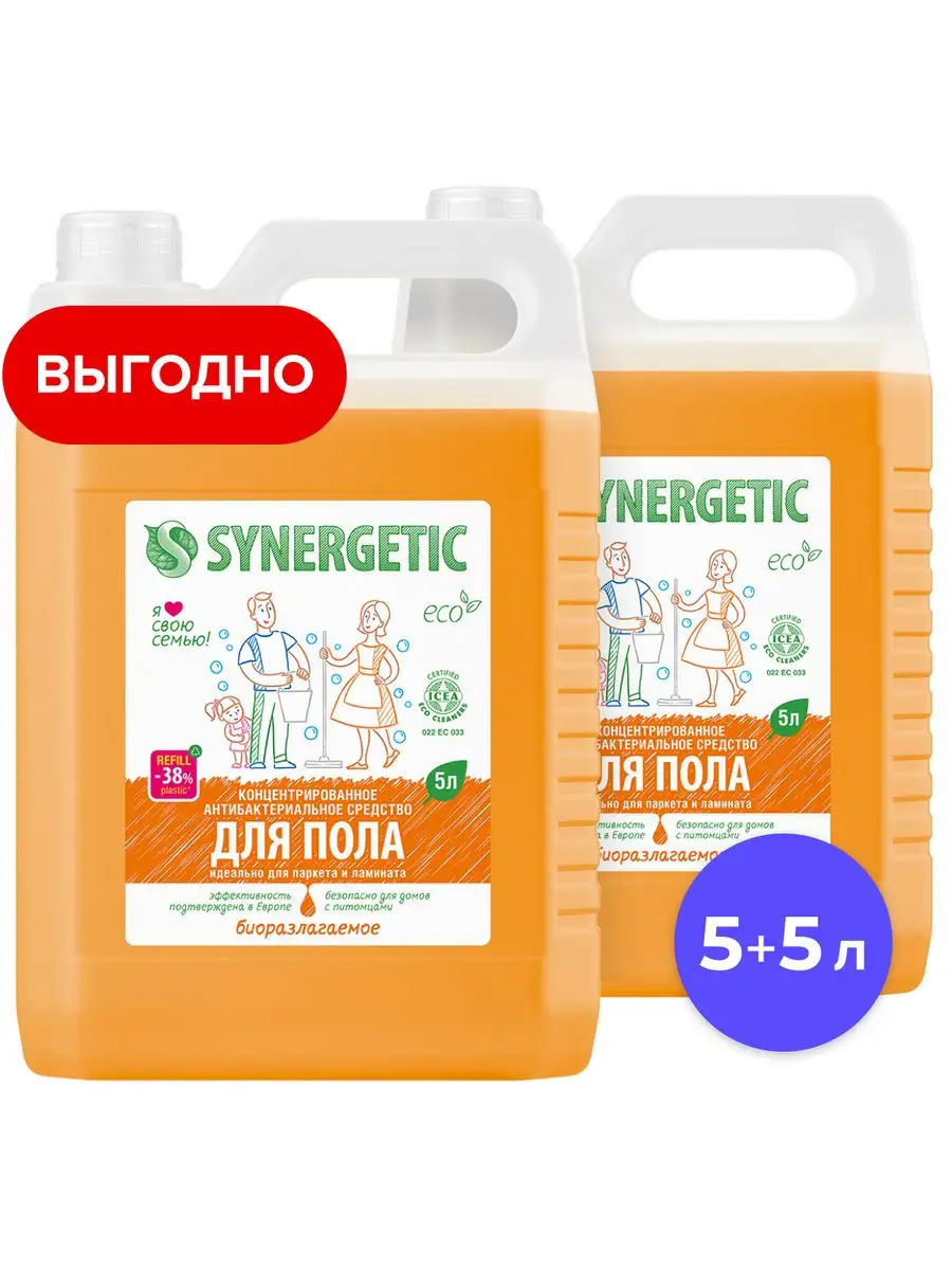 Описание: Биоразлагаемое концентрированное средство для мытья поверхностей SYNERGETIC – универсальное средство для ежедневной и генеральной уборки пола и других поверхностей: столов, стен, потолка. Уникальный комплекс растительных тензидов эффективно удаляет загрязнения и неприятные запахи даже в холодной воде. Комплекс зеленых хелатов предотвращает повторное оседание загрязнений на поверхности. Подходит для металла, стекла, пластика, дерева. Международный экологический сертификат ICEA подтверждает биоразлагаемость, безопасность и эффективность средства. Не требует смывания, не оставляет разводов на поверхности. Подходит для уборки в детских комнатах и учреждениях. Безопасно для домов с питомцами. Содержит гипоаллергенную отдушку с натуральными эфирными маслами сантала, бергамота, мяты и лимона. Инструкция по применению : Добавить в воду 30 мл средства на пять литров воды для обычной уборки или 120 мл средства на пять литров воды для генеральной уборки. Не требует смывания. 1 колпачок (30мл) на 5 литров воды-обычная уборка, 4 колпачка (120 мл) на 5 литров воды -генеральная уборка. Условия хранения: Хранить при температуре не выше 45 °C; под воздействием солнечных лучей возможно изменение цвета. Средство замерзает, после размораживания и перемешивания сохраняет свои свойства. *** У нас есть акции и распродажи, вы можете купить наши товары в подарок со скидкой!