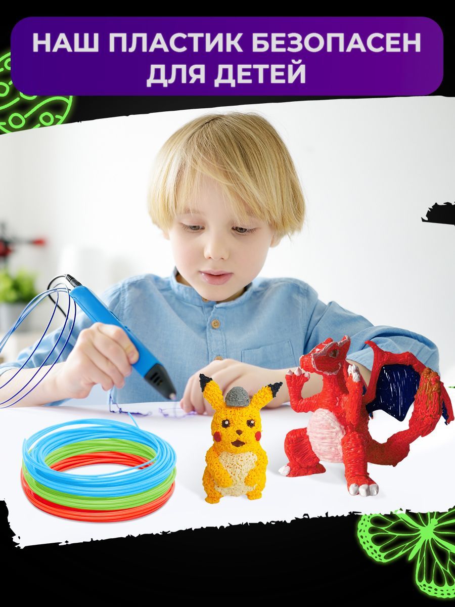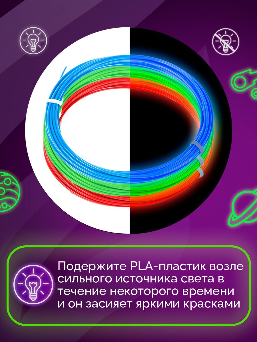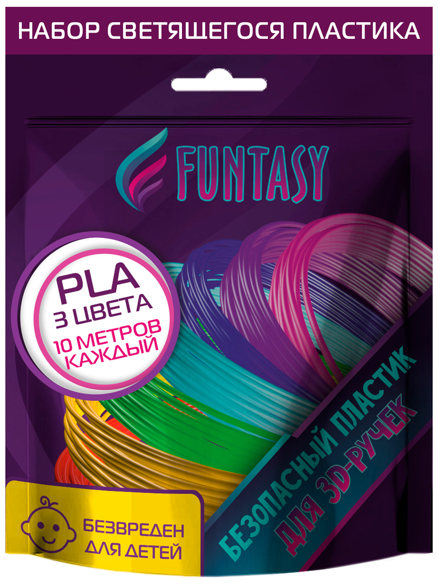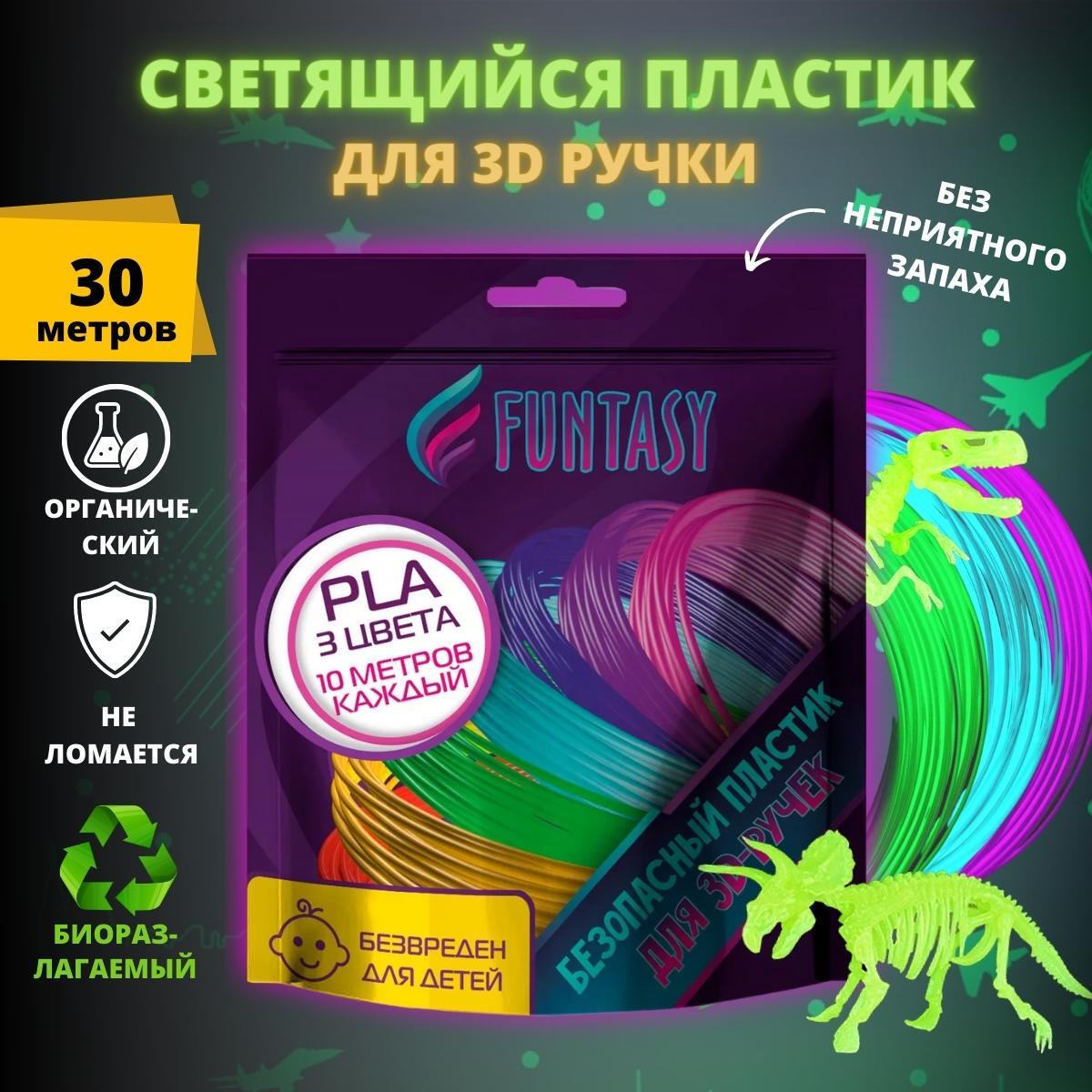 Набор светящегося PLA-пластика для 3D-ручек Funtasy 3 цвета по 10 метров Набор БЕЗОПАСНОГО пластика БЕЗ ЗАПАХА для детей / Цвета для 3д ручки/Леска пластмасса /Картриджи