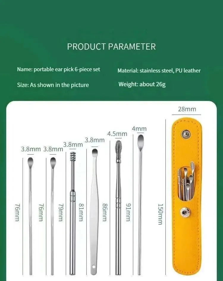 • Держите уши чистыми и здоровыми:Набор медицинских ушных ложек из нержавеющей стали из 6 предметов предназначен для того, чтобы ваши уши оставались чистыми и здоровыми, предотвращая накопление воска или других загрязнений.