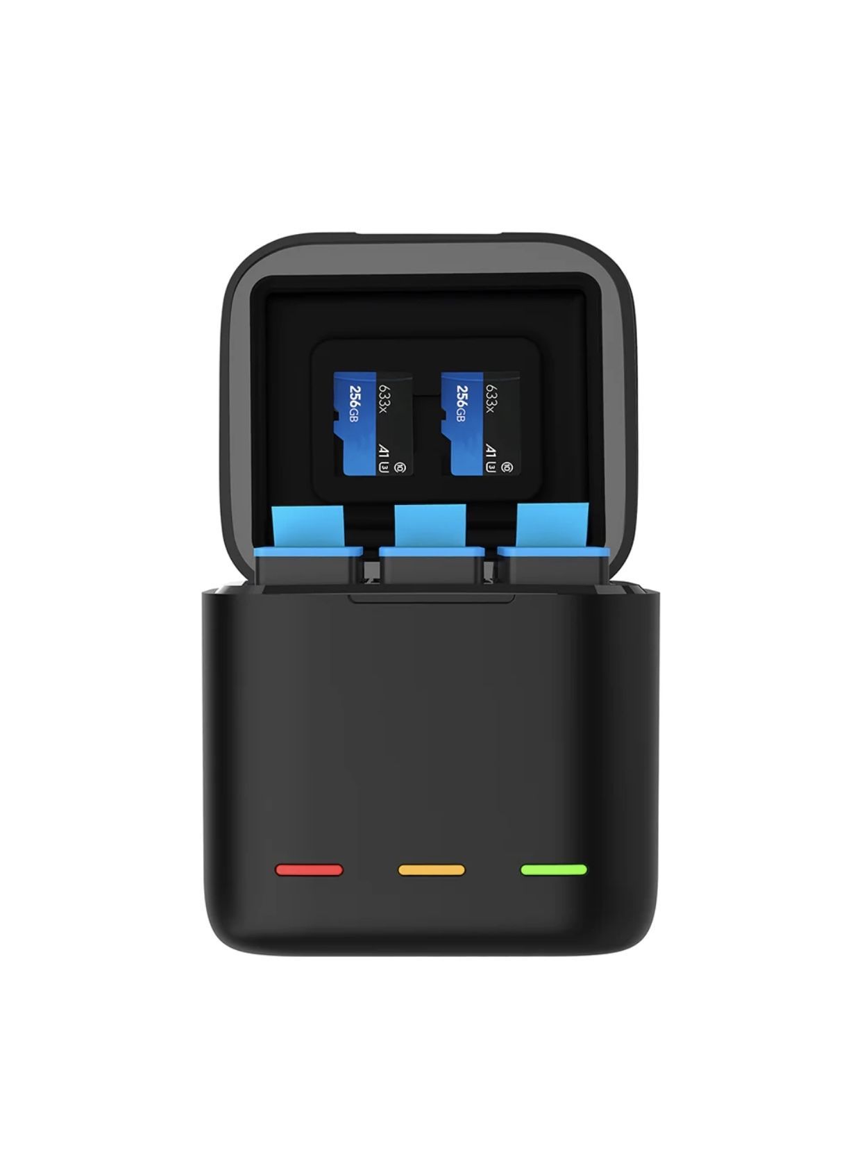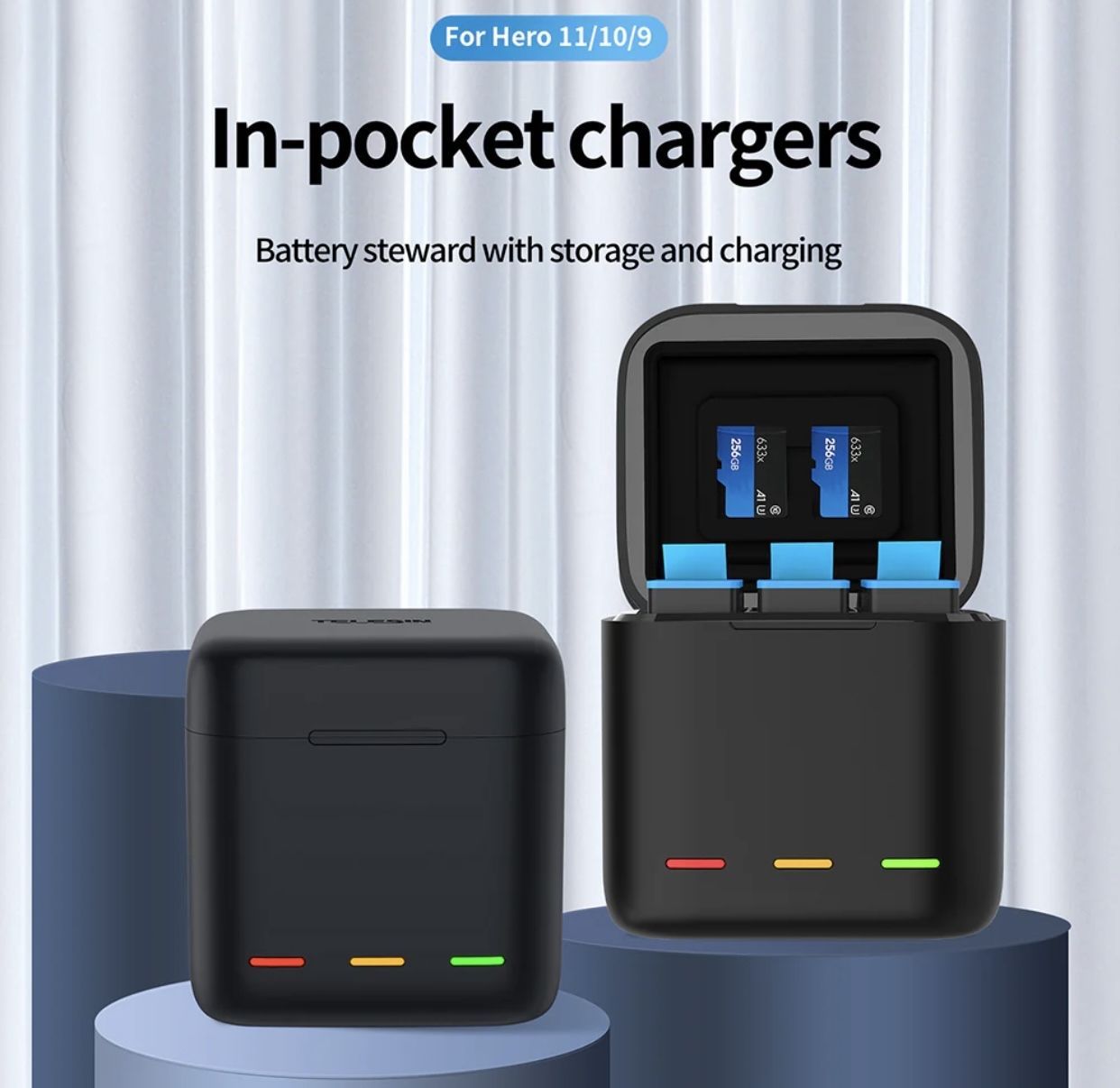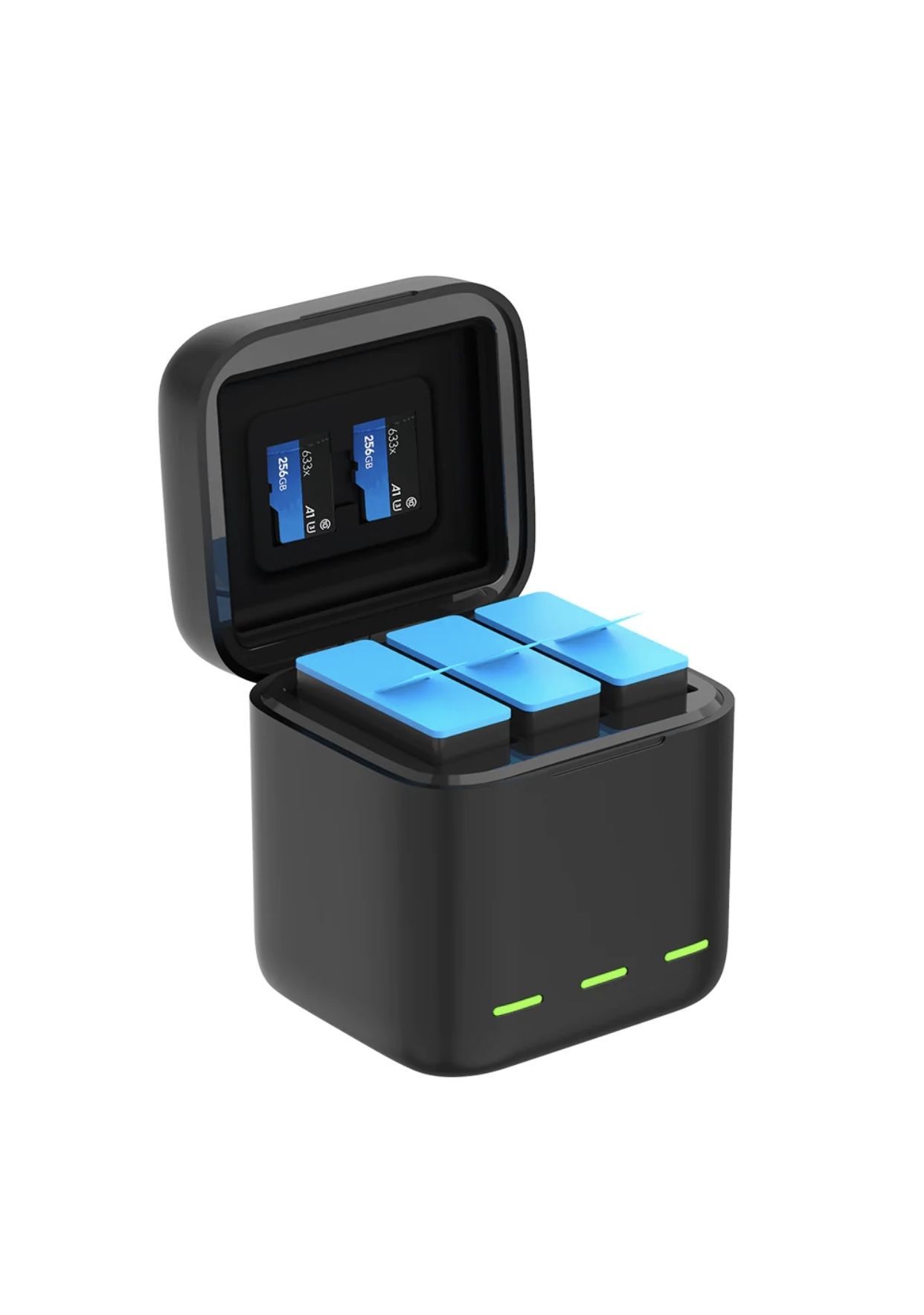 С помощью куба Telesin вы не только можете заряжать, но и хранить три аккумулятора и две карты памяти. Емкость дополнительных аккумуляторов Telesin для экшен камеры GoPro 1750 mAh. До 112 минут съемки на одном аккумуляторе (разное время использования в разных режимах).