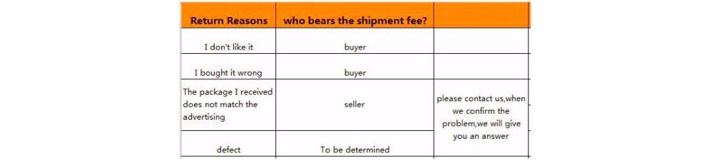 1. Если вы не удовлетворены полученным товаром, пожалуйста, верните его в течение 7 дней для возврата или возврата денег. Пожалуйста, свяжитесь с нами, прежде чем вернуть его.