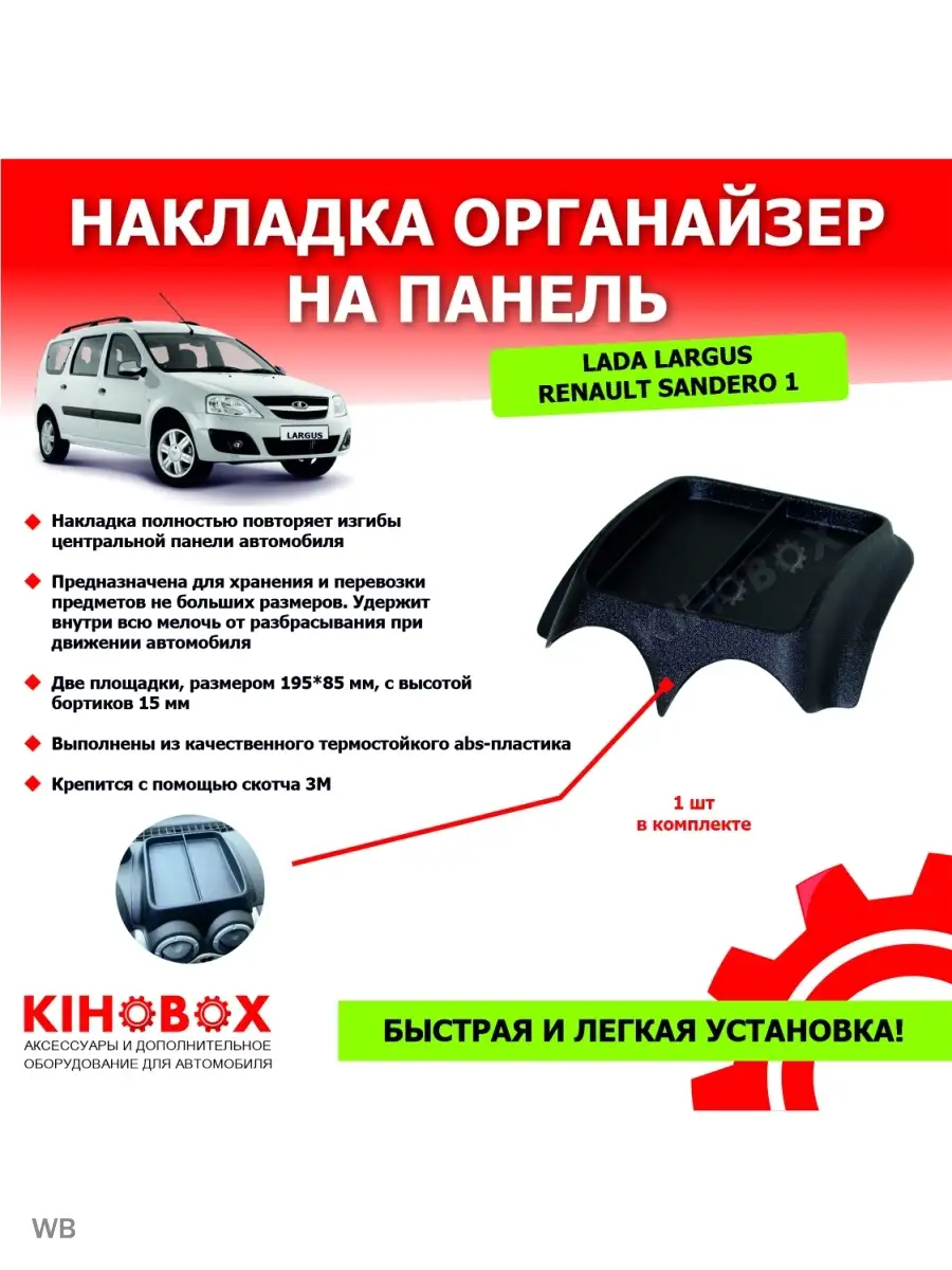 Описание: Накладка органайзер на панель Lada Largus, Renault Sandero 1. Применяемость: Лада Ларгус, Лада Ларгус Кросс, Рено Сандеро 1. Накладка полностью повторяет изгибы центральной панели автомобиля. Предназначена для хранения и перевозки предметов не больших размеров. Две площадки, размером 195*85 мм, с высотой бортиков 15мм, удержат внутри всю мелочь от разбрасывания при движении автомобиля. Выполнена из качественного abs-пластика. Крепление с помощью скотча 3М. Установка не займет много сил и времени. Сначала насухо протрите место установки, обезжирьте поверхность, снимите защитную пленку со скотча, приклейте накладку. Установку выполнять в теплом помещении и желательно с применением фена. Материал: термостойкий ABS-пластик. Цвет: чёрный, тип тиснения: Шагрень. Комплектация: накладка органайзер - 1 шт.