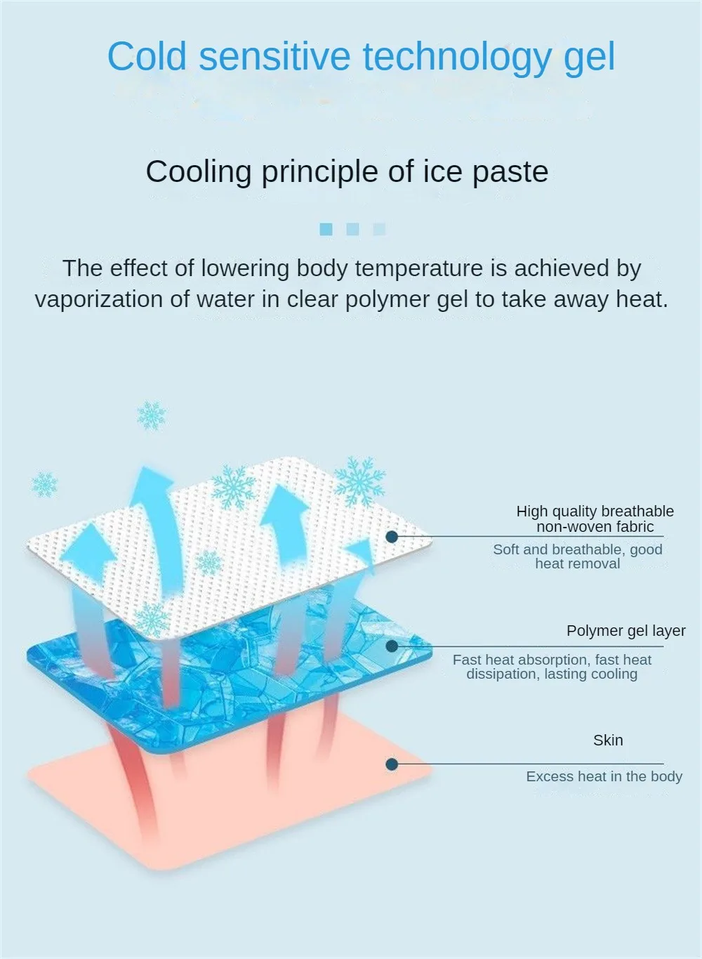 2. гель технологии холодного чувства, принцип охлаждения ледяной пасты, через воду в испарении водяного полимерного геля, чтобы отнять тепло, чтобы добиться эффекта снижения температуры тела
