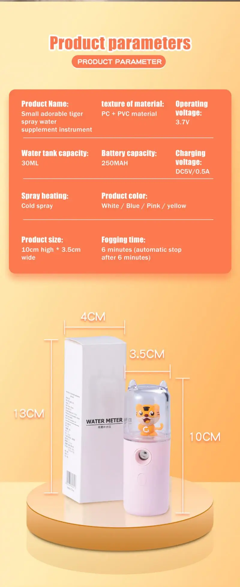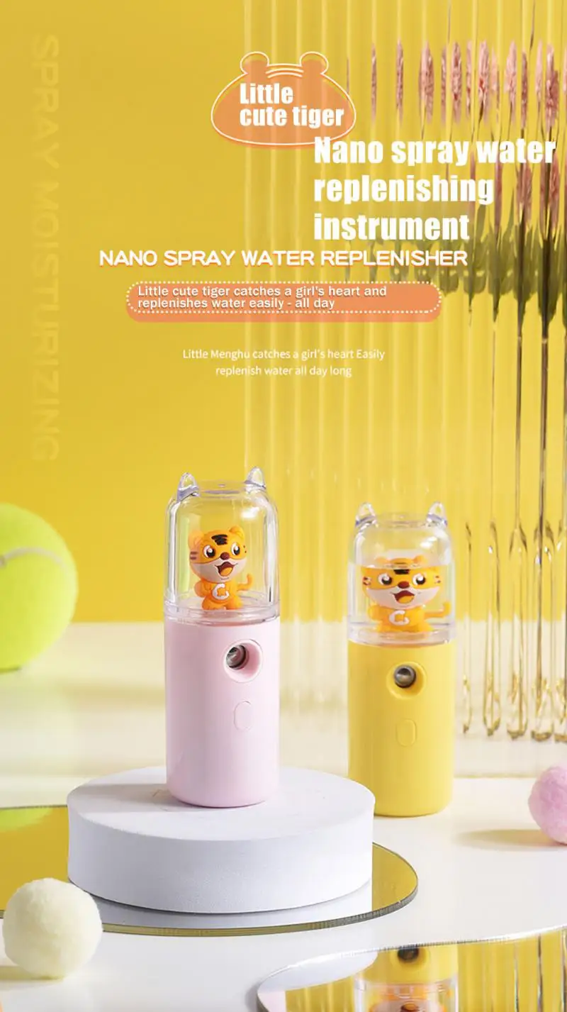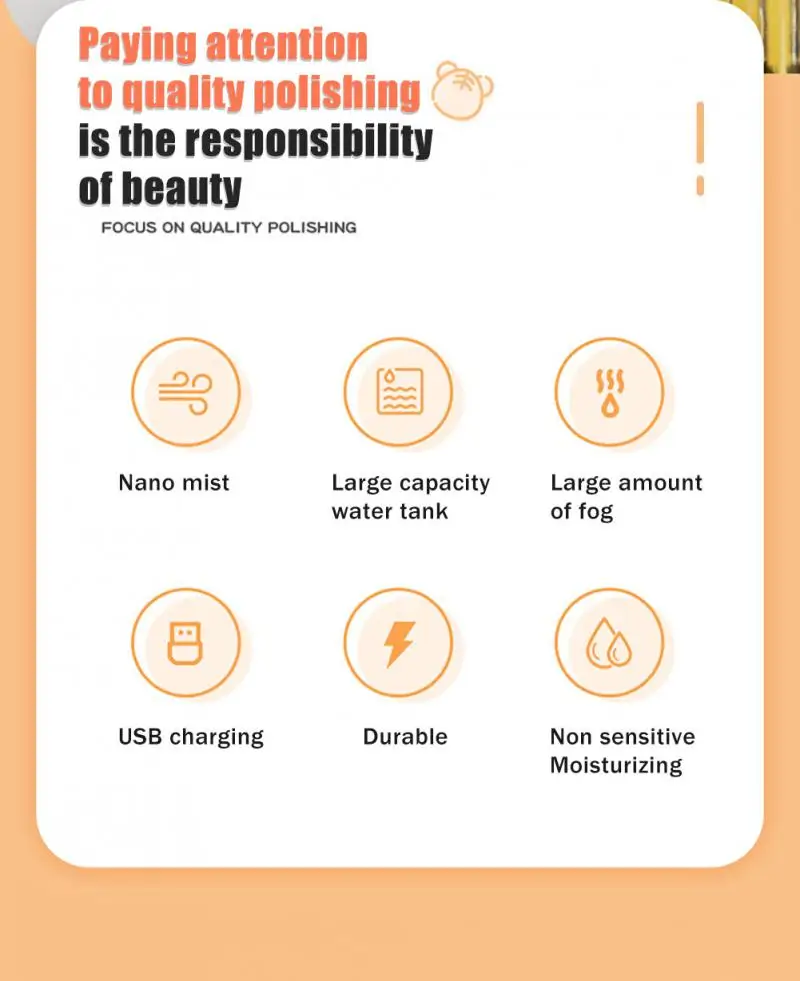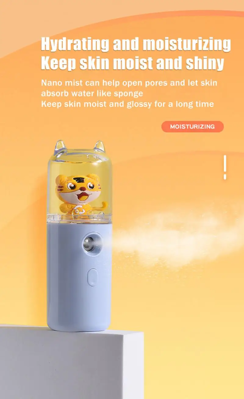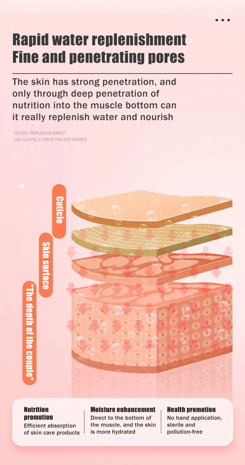 1. Нано-спрей, глубокое увлажнение, распыленная влага может проникать в поры кожи к подкожной клетчатке
