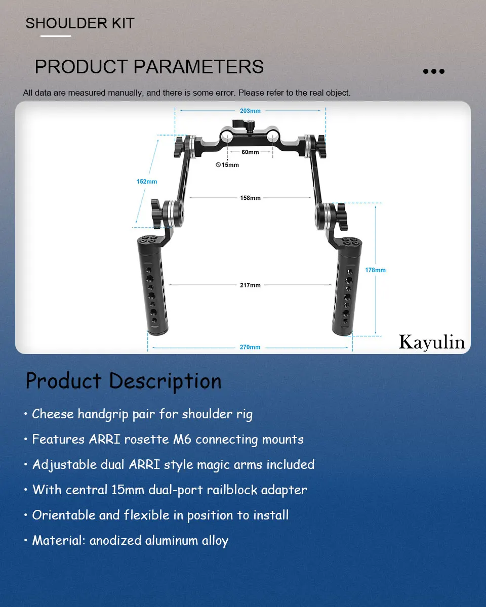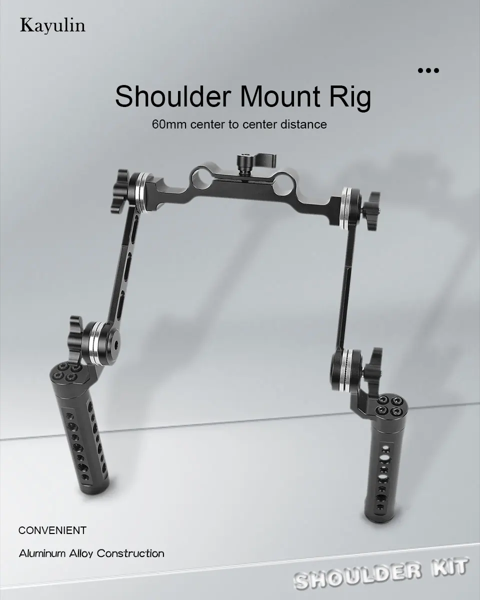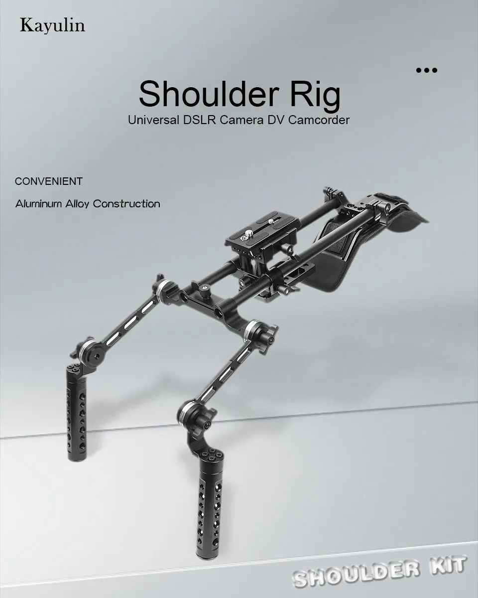 • Пара рукоятки Kayulin для крепления на плечо DSLR представляет собой регулируемую систему рукоятки с двойным резиновым покрытием, он оснащен соединительным креплением ARRI Rosettes M6, которое позволяет ориентировать или регулировать рукоятку практически в неограниченном положении. Его Подпружиненные ручки блокируют и легко и быстро управляют системой буровой установки.