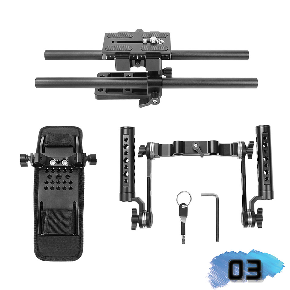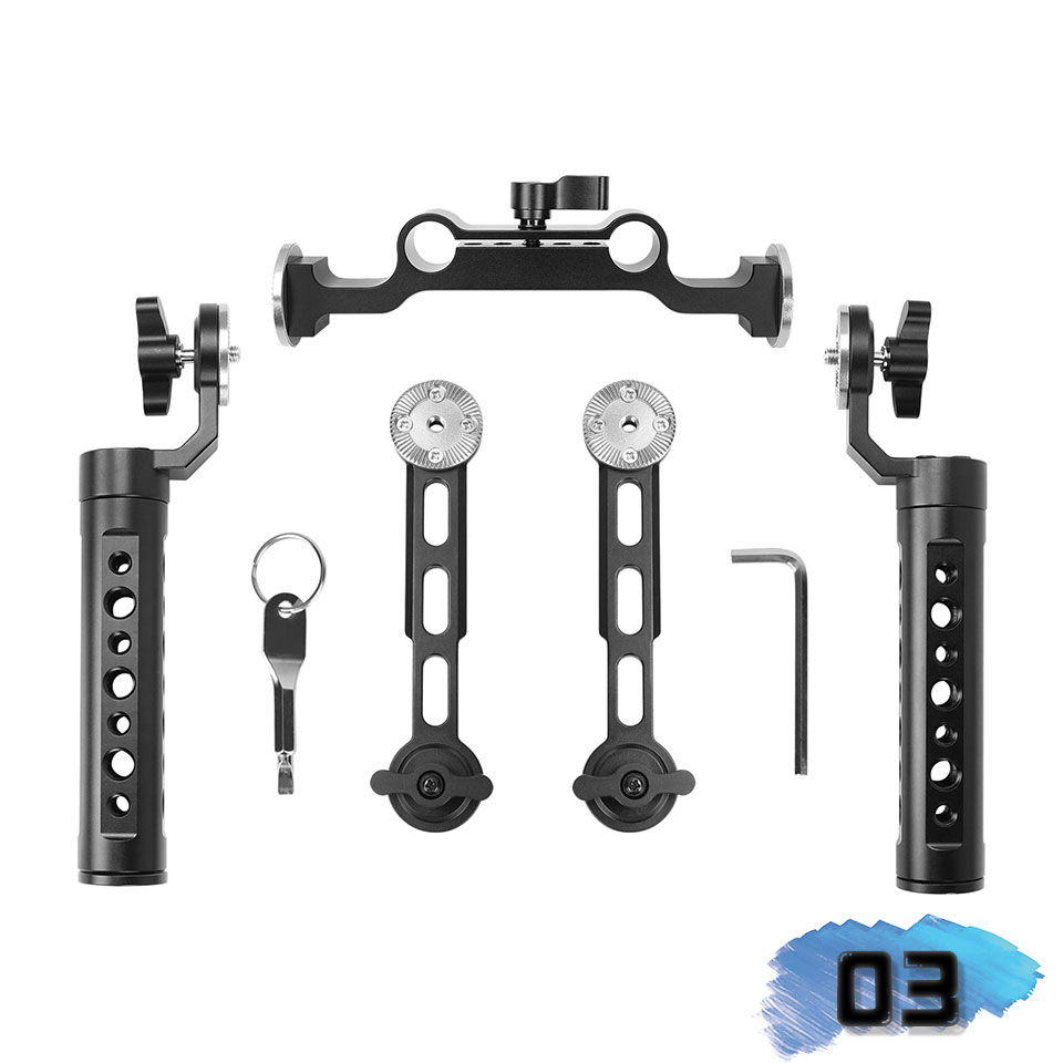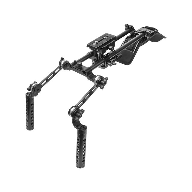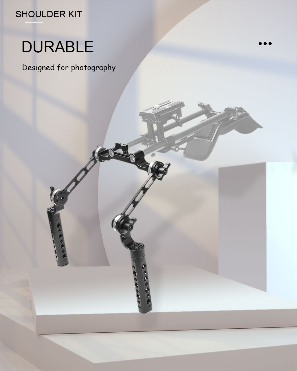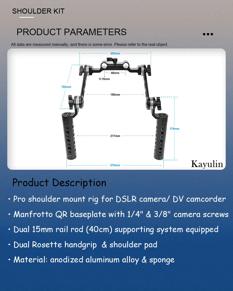 • Пара рукоятки Kayulin для крепления на плечо DSLR представляет собой регулируемую систему рукоятки с двойным резиновым покрытием, он оснащен соединительным креплением ARRI Rosettes M6, которое позволяет ориентировать или регулировать рукоятку практически в неограниченном положении. Его Подпружиненные ручки блокируют и легко и быстро управляют системой буровой установки.