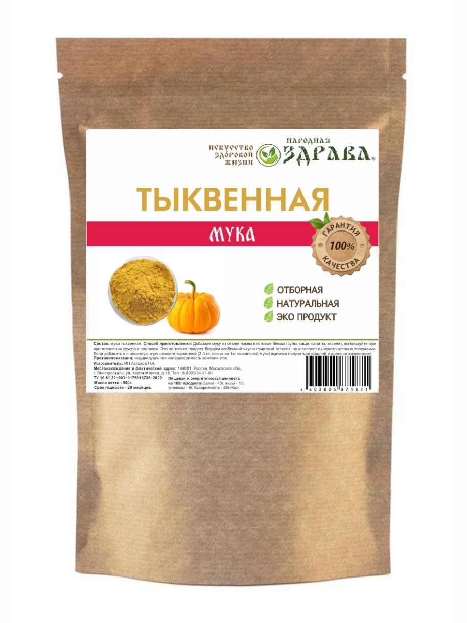 Применение: Добавьте муку из семян тыквы в готовые блюда (супы, каши, салаты, кисели), используйте при приготовлении соусов и подливок. Это не только придаст блюдам особенный вкус и приятный оттенок, но и сделает их исключительно полезными. Если добавить в пшеничную муку немного тыквенной (2-3 ст. ложки на 1кг пшеничной муки) выпечка получиться пышной и долго не зачерствеет.