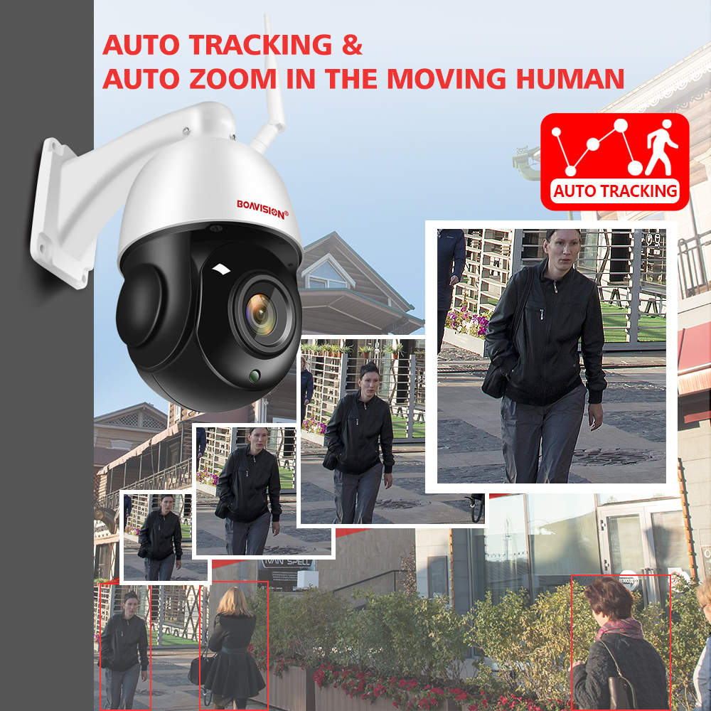 Камера будет регулировать вращение панорамирования/наклона и увеличивать автоматически, захватывая четкие контрольные цели и автоматическое отслеживание движения человека, а также нажимать оповещения по электронной почте или уведомления на ваш телефон.