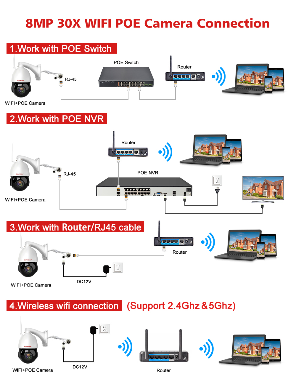 (Камера Wi - Fi с функцией POE, которая не только поддерживает беспроводное соединение Wi - Fi, но и работает с коммутатором POE nvr / POE без подключения дополнительного источника питания.)