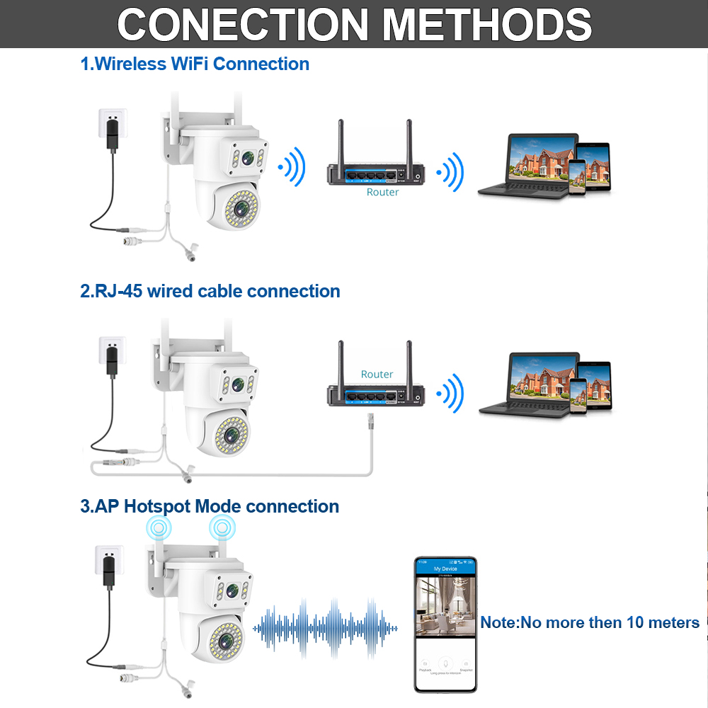 Оснащенный адаптером DC12V, вы можете подключить камеру к сети Wi-Fi. Вы можете настроить подключение Wi-Fi камеры или поиск по локальной сети, подключиться к маршрутизатору через сетевой кабель и работать только с Wi-Fi 2,4G (не поддерживается 5G).