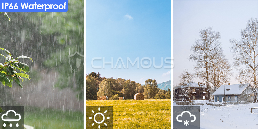 -Оснащен водонепроницаемым уровнем IP66, чтобы камера выдержала различные суровые условия. Рабочая температура-20 ° ~ 50 °, вы можете абсолютно легко поставить его на улицу