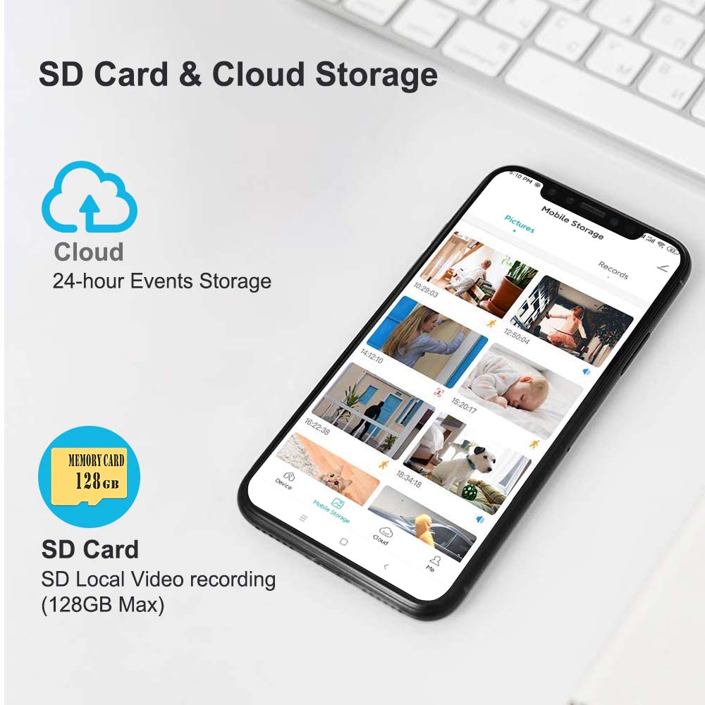 Эта камера видеонаблюдения поддерживает карту памяти Micro SD до 128 ГБ (видео можно воспроизводить в локальной сети). Облачное хранилище, чтобы избежать риска потери отснятого материала с SD-карты. Вы можете войти в зашифрованное приложение для мобильного телефона, чтобы мгновенно определить отснятый материал с помощью интеллектуальной временной шкалы и воспроизвести его в бесшовном и блестящем качестве HD (размер пространства SD-карты можно выбрать в опциях!)."