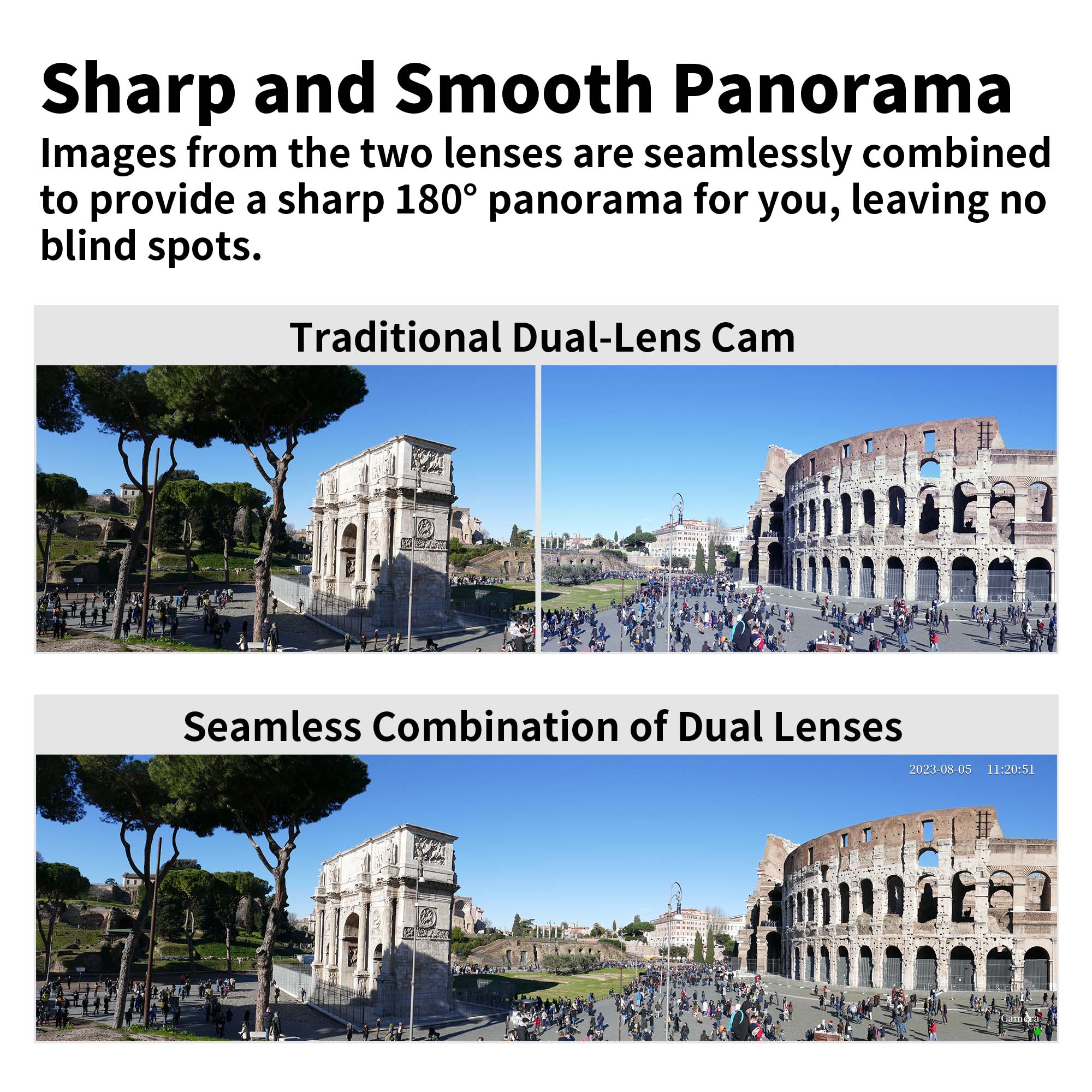 * Съемка двумя объективами, автоматически объединенными в одно изображение, обеспечивая полный широкоугольный обзор изображения и видео на 180 ° без искажений и разрывов изображения.