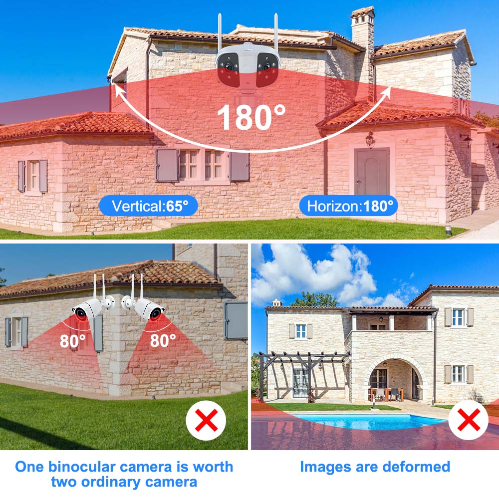 * По сравнению с другими камерами видеонаблюдения Бинокулярные камеры имеют более широкое поле зрения, они могут видеть поле зрения 180 °, видеть шире, подходит для установки на улице или на заводе и других обширных территориях.