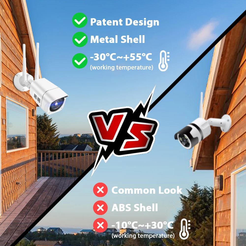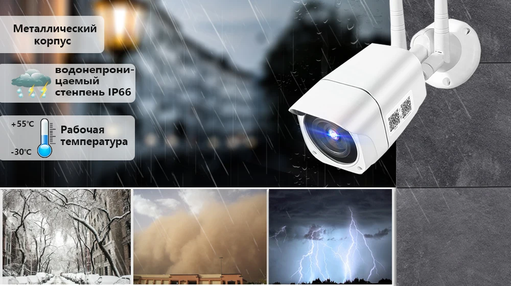 Благодаря высококачественному металлическому материалу и профессиональному водонепроницаемому дизайну IP66, ваша камера будет нормально работать при температуре -4F ~ 122F (-30 ° ~ 55 °) как в дождливый, так и в снежный день.