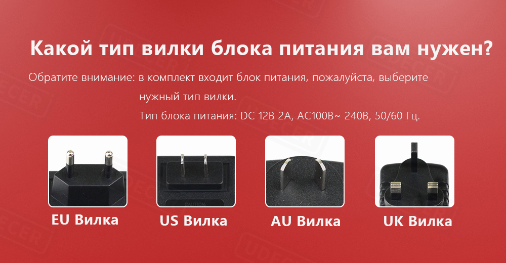 Обратите внимание: в комплект входит питание, пожалуйста, выберите нужный тип штекера: тип источника питания: 12 В постоянного тока, 2 А, 100 ~ 240 В переменного тока, 50/60 Гц.