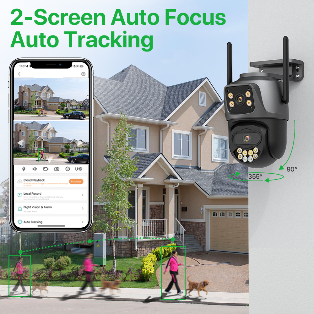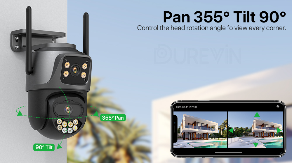Благодаря горизонтальному 355 ° и вертикальному 90 ° вы можете удаленно управлять наружной камерой Wi-Fi, чтобы просматривать каждый угол с помощью мобильного телефона.