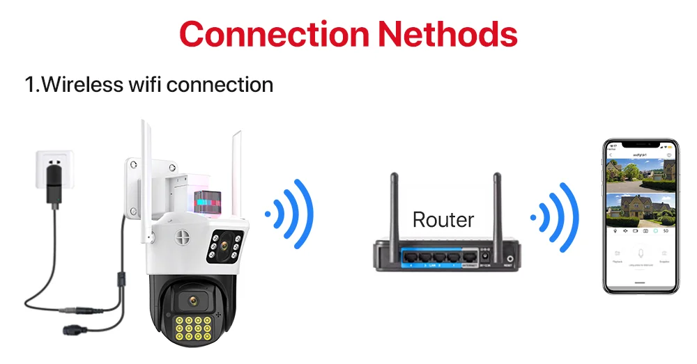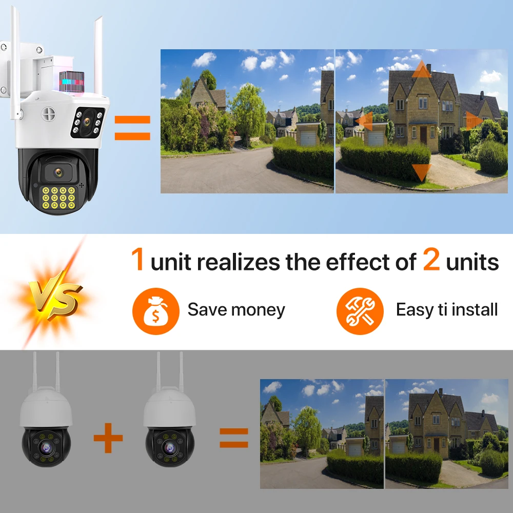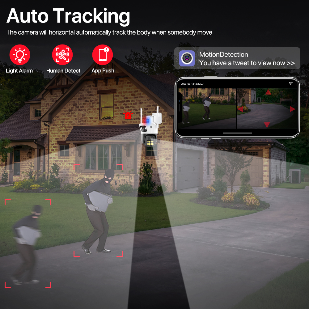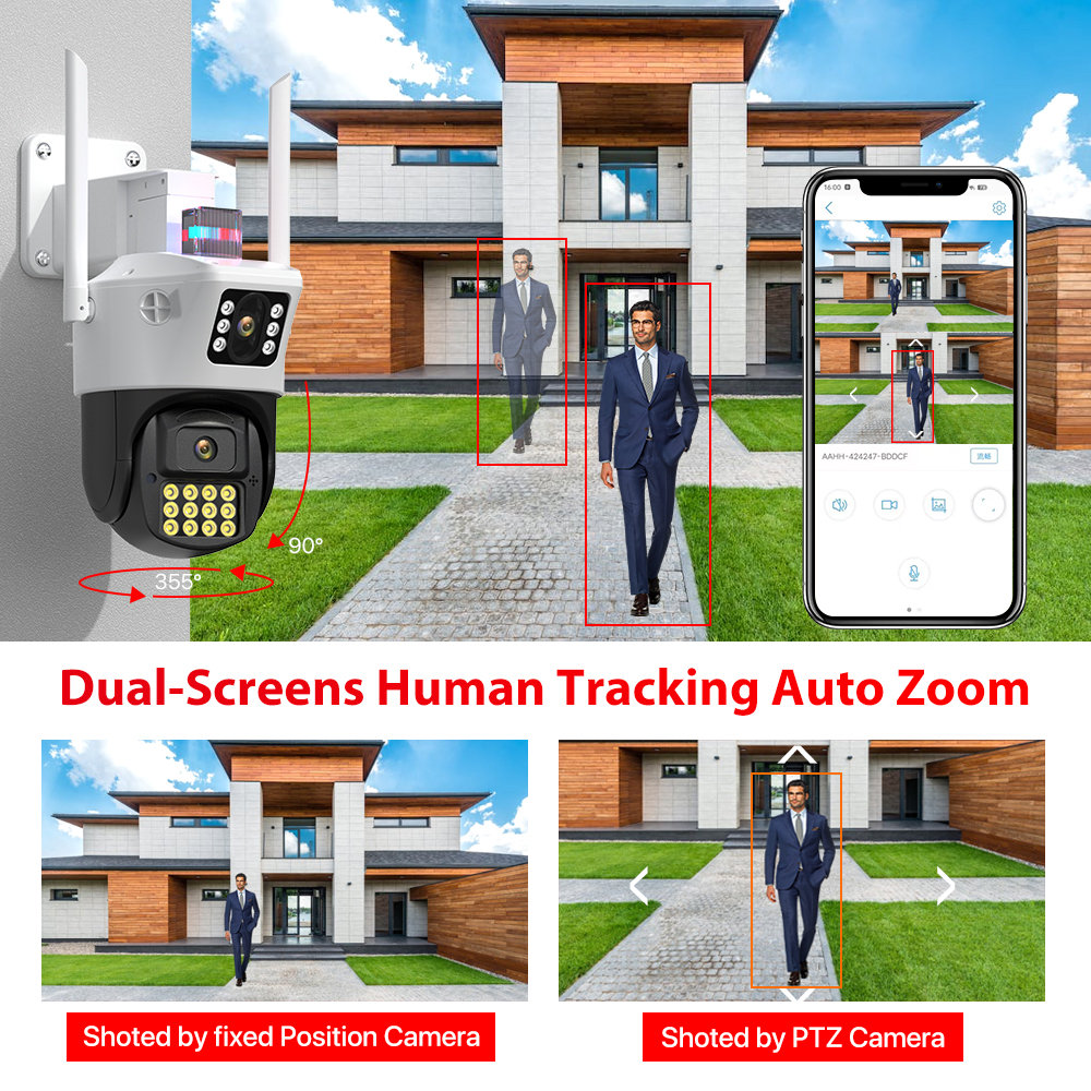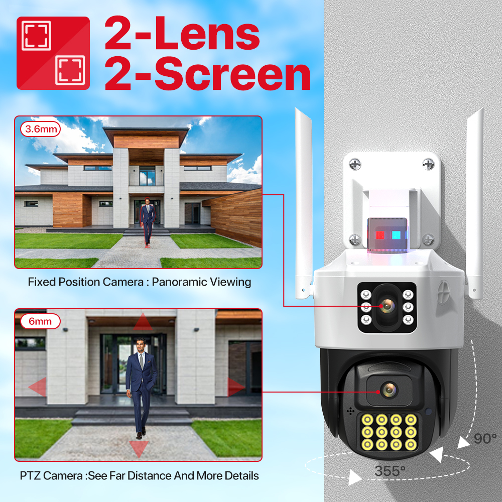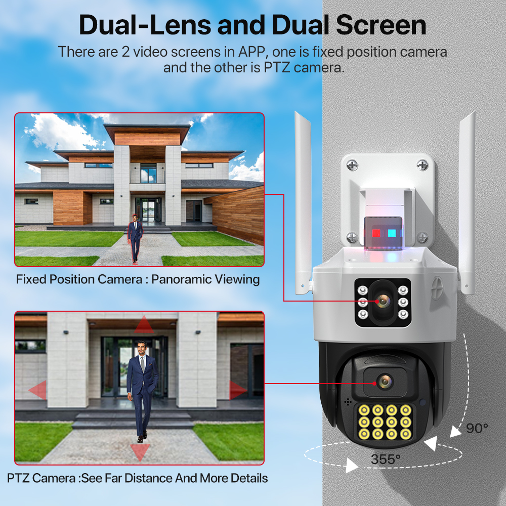 -Благодаря горизонтальному 355 ° и вертикальному 90 ° вы можете удаленно управлять наружной камерой Wi-Fi, чтобы просматривать каждый угол с помощью мобильного телефона.