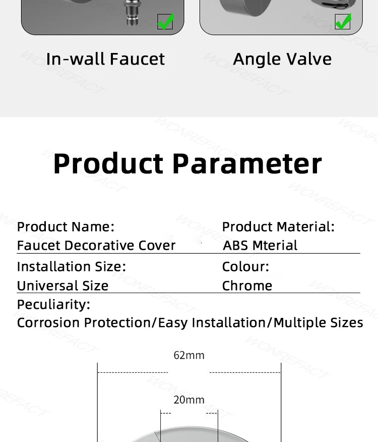 Эти украшения крышки трубы могут быть широко установлены на существующих трубопроводах, таких как водопроводные трубы, газовые трубы, угловые клапаны, отопительные трубы, смесители, радиатор, дренажная линия и т. д.