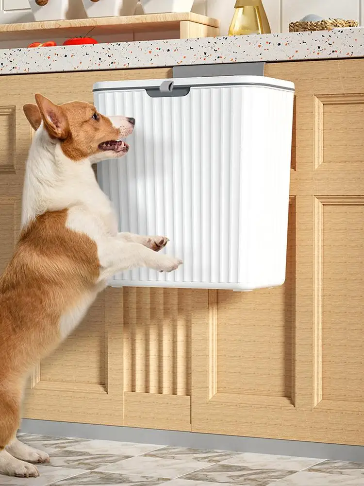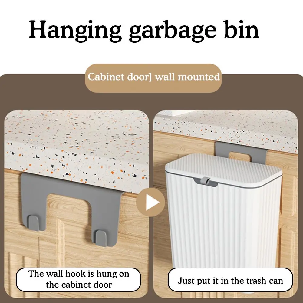 2. Настенное крепление или подвешивание: каждое кухонное мусорное ведро содержит крючок и клейкую доску. Его можно повесить на дверцу шкафа, вам не нужно наклоняться, чтобы выбросить предметы. Толщина двери должна быть менее 0,95 дюйма (2,5 см), она должна висеть на стене с помощью клейкой доски или прямо на столешнице или на земле.