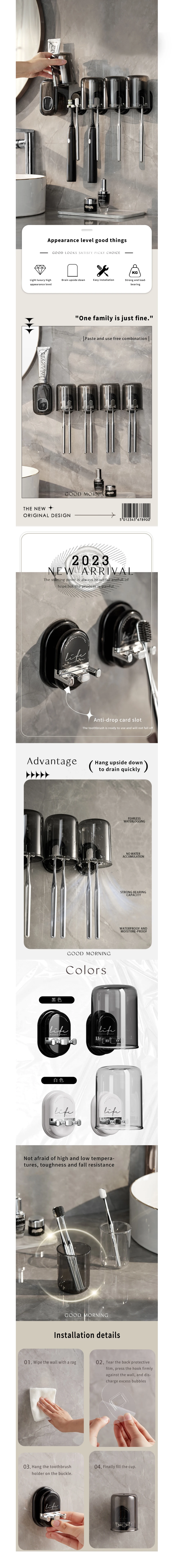 • Настенная конструкция:Настенная конструкция этого держателя для зубных щеток экономит место и поддерживает порядок в ванной комнате, облегчая ее чистку и обслуживание.