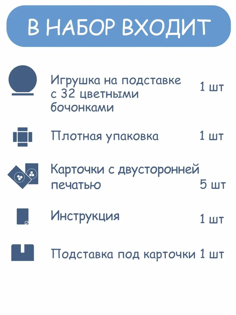 Комплектация 1 плотная упаковка; игрушка на подставке с 32 цветными бочонками; 5 карточек