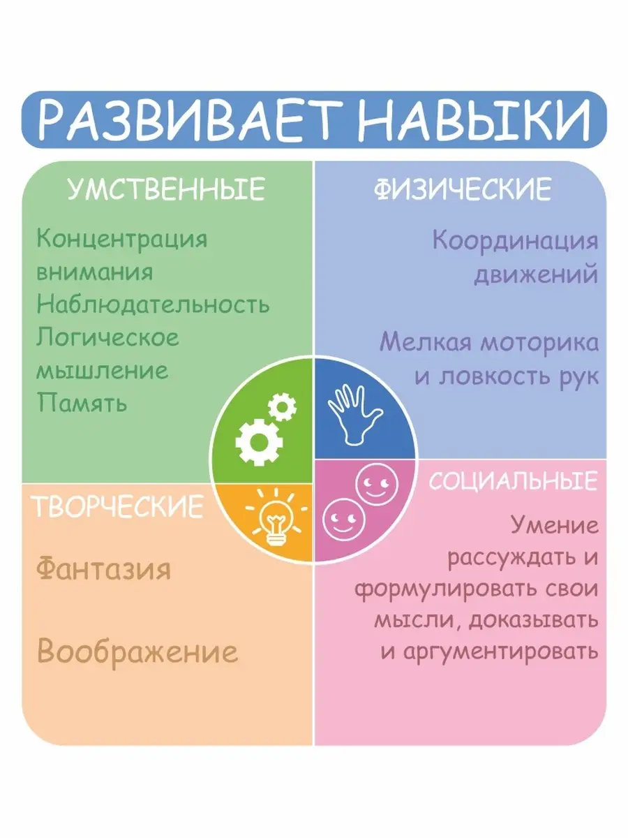Тренируемые навыки Развитие речи, логики, творческого мышления; Память, воображение, сенсорное восприятие; Мелкая моторика ,внимательность,усидчивость