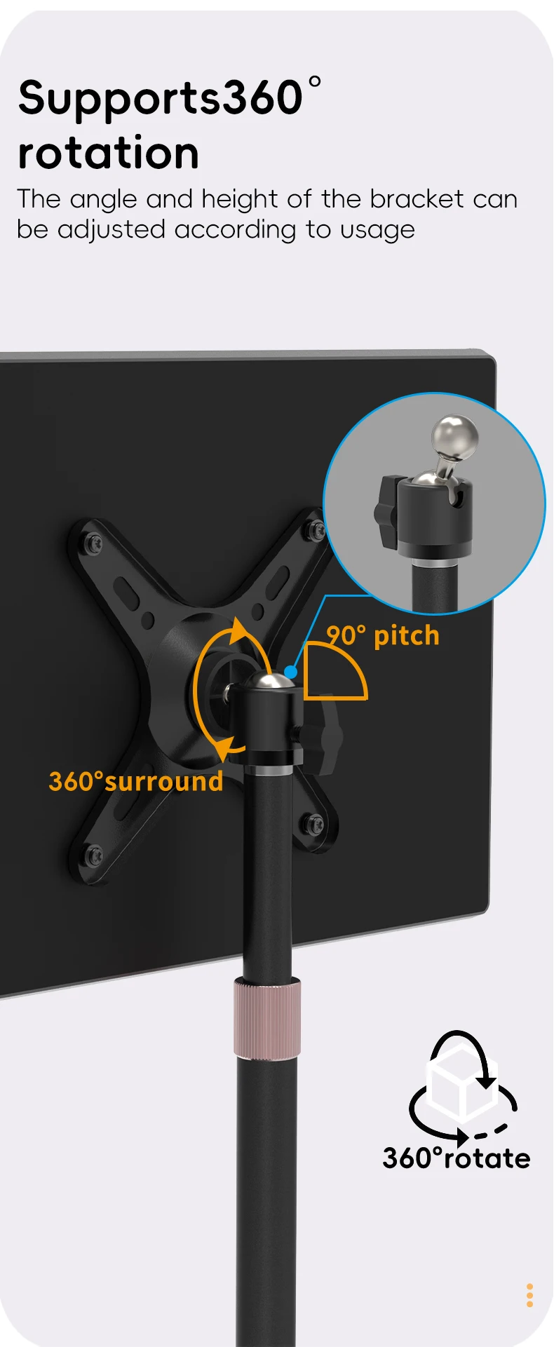 ГИБКОЕ ПОЛОЖЕНИЕ ЭКРАНА-Благодаря регулируемому кронштейну он предлагает наклоны +/- 30 °, повороты +/- 25 °, вращения +/- 180 °, и регулируемая высота до 25 см для различных положений сидения. Подставка VESA поддерживает Портретные или Ландшафтные формы, благодаря которым вы можете перемещать монитор горизонтально и вертикально.