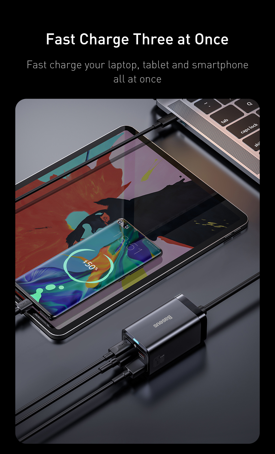 BPS II charging technology offers smart power distribution for fast charging a laptop ,tablet and phone simultaneously via three channels.