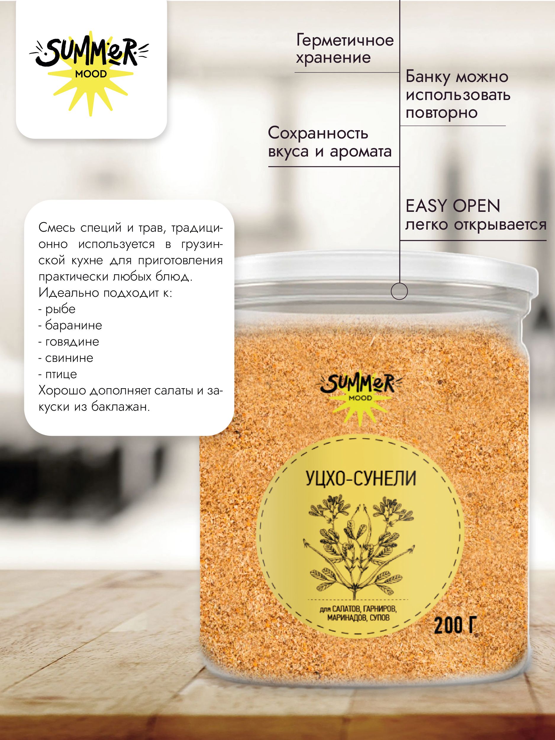 Наша приправа поставляется в удобной банке для хранения с системой закрывания Easy open, Что позволяет всегда оставаться УЦХО свежей и ароматной. С маркировкой Элпис приправа Уцхо сунели