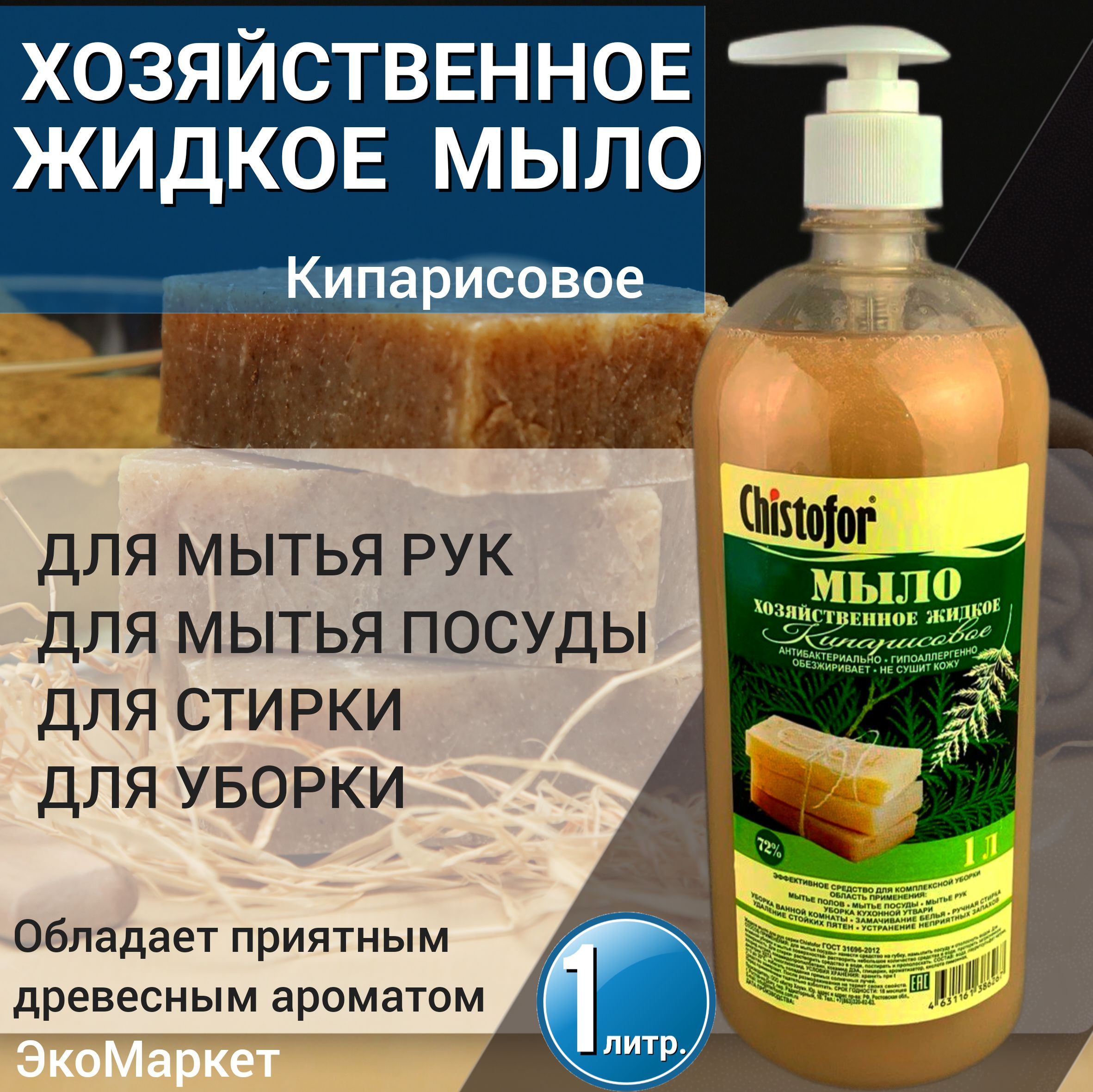 Настоящее хозяйственное мыло жидкое по ГОСТу 72% с древесным ароматом "Кипарисовое" 1 литр с дозатором.